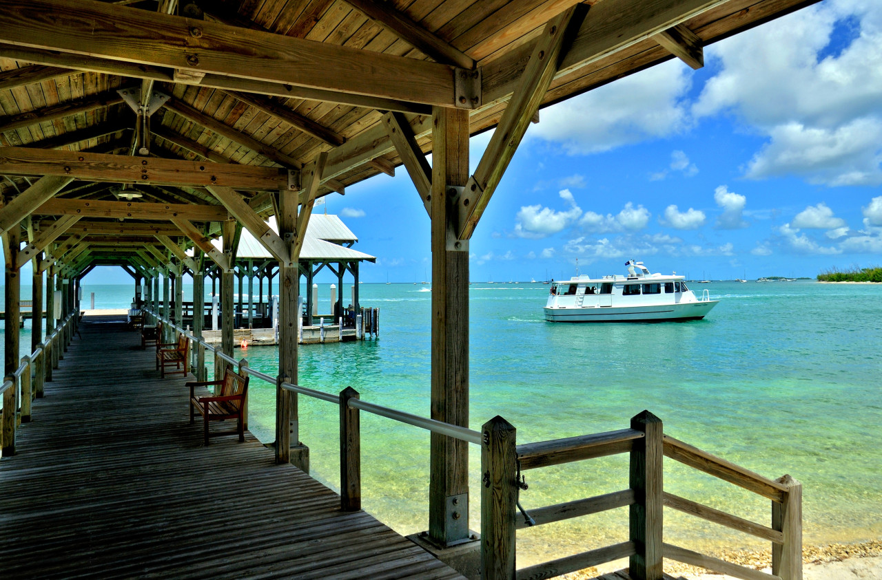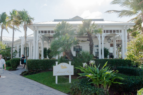 Our tour begins when the ferry arrives at the dock on Sunset Key. There is an air of distinction as soon as you land and step onto the iconic boat house dock. Private crescent shaped beaches and coconut palms create an impressive entry point at the shore. Past the dock, a brick path leads to a classic island-colonial style building. It is here where you find reception, resort amenities, and the Latitudes Restaurant and bar.