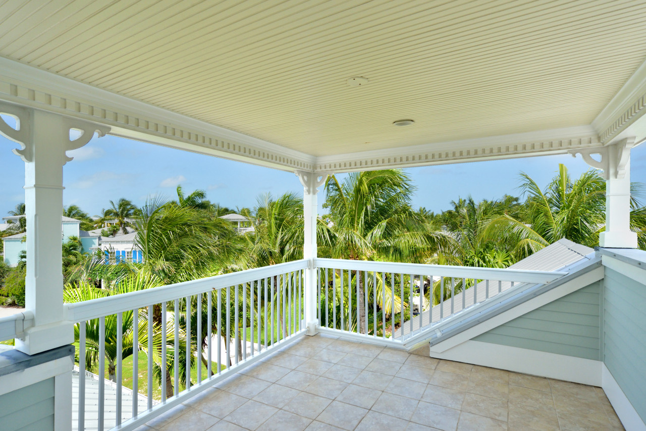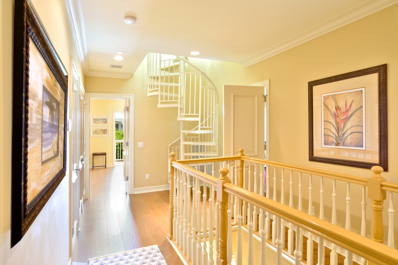 2nd Floor: The wooden banister staircase is a beautiful feature of the Key West Sunset Sojourn. This is an architectural style found in some of the grand historic 1900’s wooden houses near the seaport in Old Town Key West. The simple swirled newel post at the base of the staircase, wide handrails, carved posts are left in natural wood to accentuate the lines. Steps, risers, and rail spindles are painted in soft white. The stairwell landing on the 2nd floor is centered in the hallway, creating a beautiful railed walk-around at the top of the staircase.