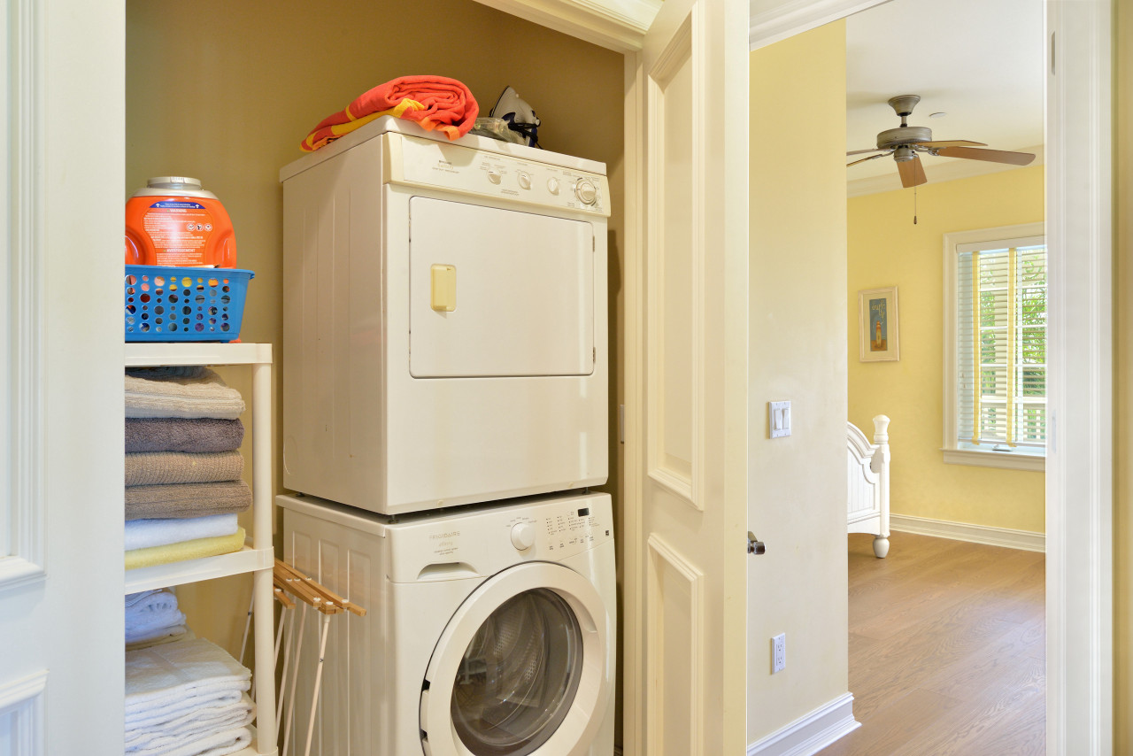 Step back into the hallway and notice the conveniently located laundry closet with stackable washer and dryer, hidden behind doors. Immediately to the right of the laundry closet, we find the entrance to bedroom four. This bedroom provides a queen size bed and is styled with a set of matching bright white cottage-style furnishings. A flat screen TV is hidden in an armoire when you are not watching.