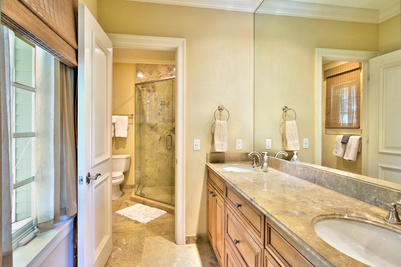 Bedroom Four: Outside access for bedroom four is through a single French door leading to the private porch. Here a set of wicker chaises are placed for outdoor lounging and enjoying the tree top view. Back inside, the beautiful en-suite bathroom provides a double wide vanity with single sink set in granite on light wood cabinets, and an oversized shower with glass walls and doors, and upscale fixtures and accessories.