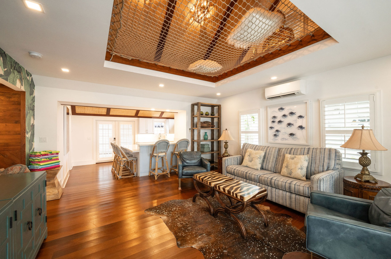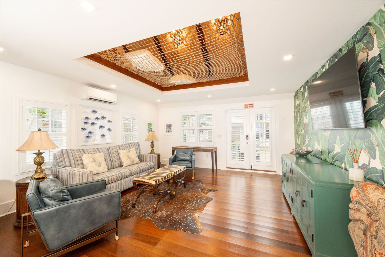 In the living room, bright green banana leaf print wallpaper is featured on one wall. A modern furniture grouping provides a sofa, two easy chairs, and large flat screen TV mounted on wall. For a surprise, look up! Overhead you’ll notice the unusual hammock netting stretched across part of the ceiling. Look closer for a peek-a-boo view of an unsurpassed meditation loft above.