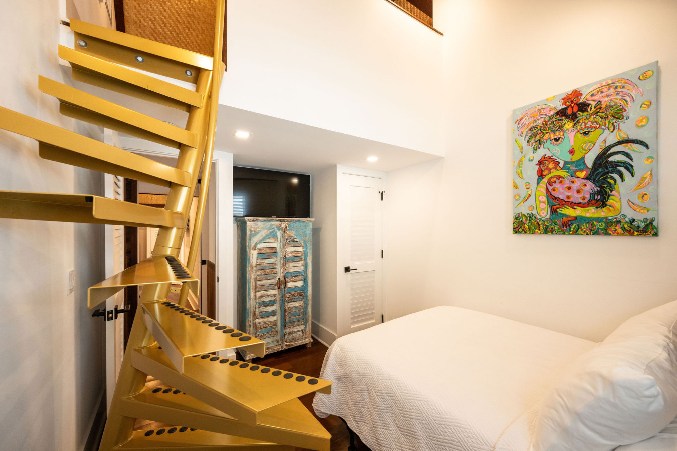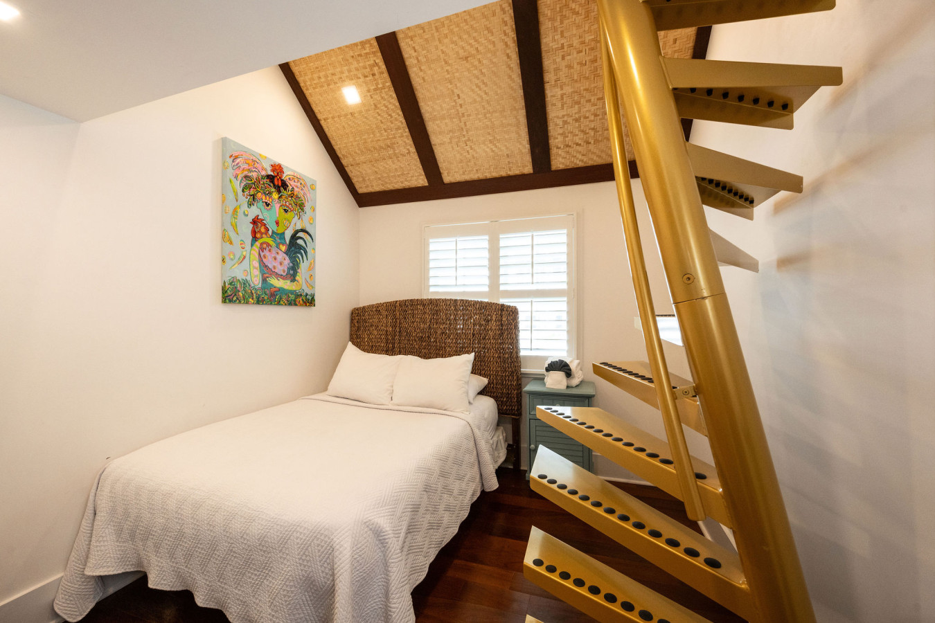 Bedroom One: Immediately to the left, the first bedroom is furnished with a full-size (double) bed with sea grass headboard. A custom spiral bright yellow metal ladder leads to the meditation loft above.