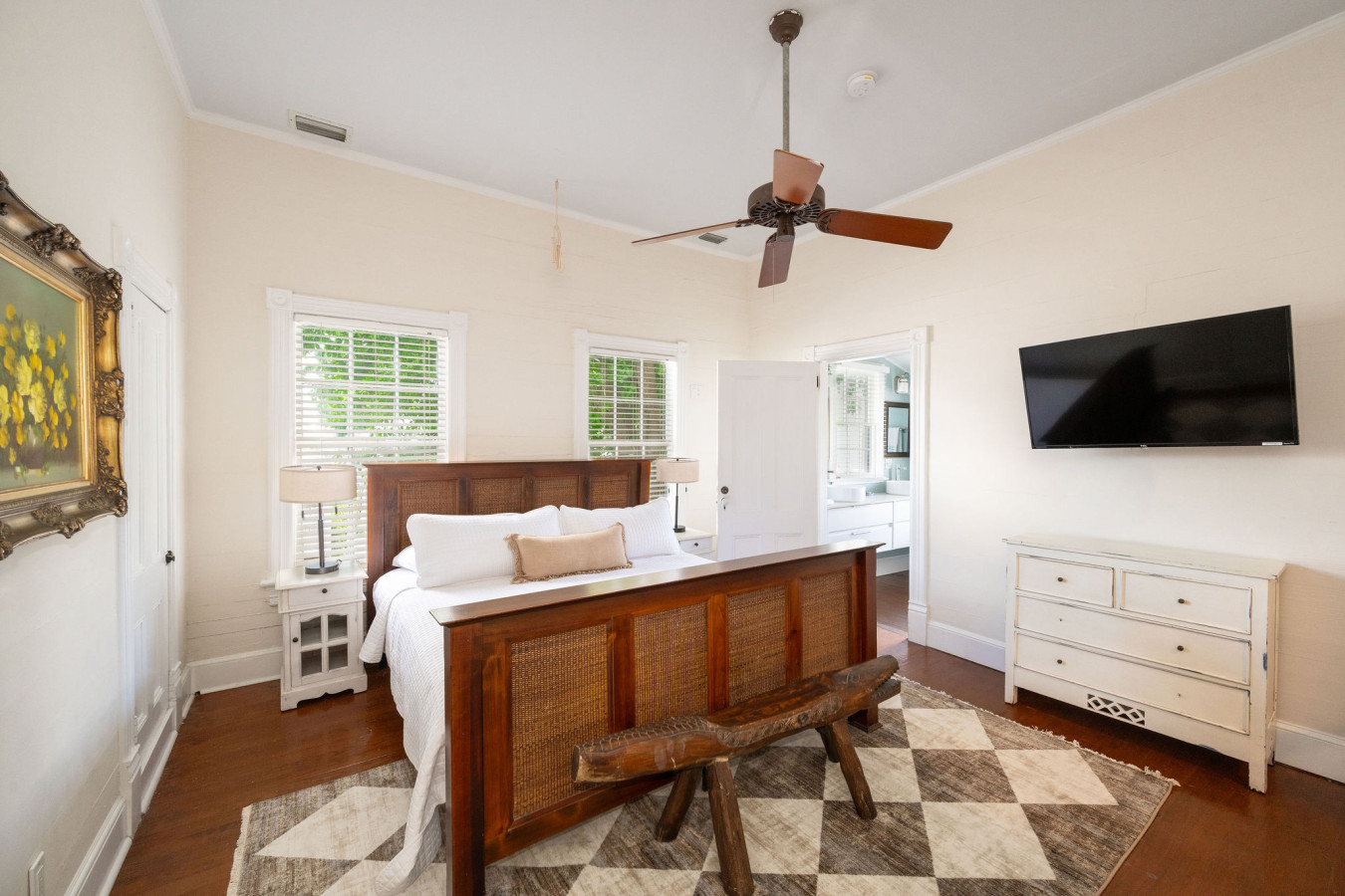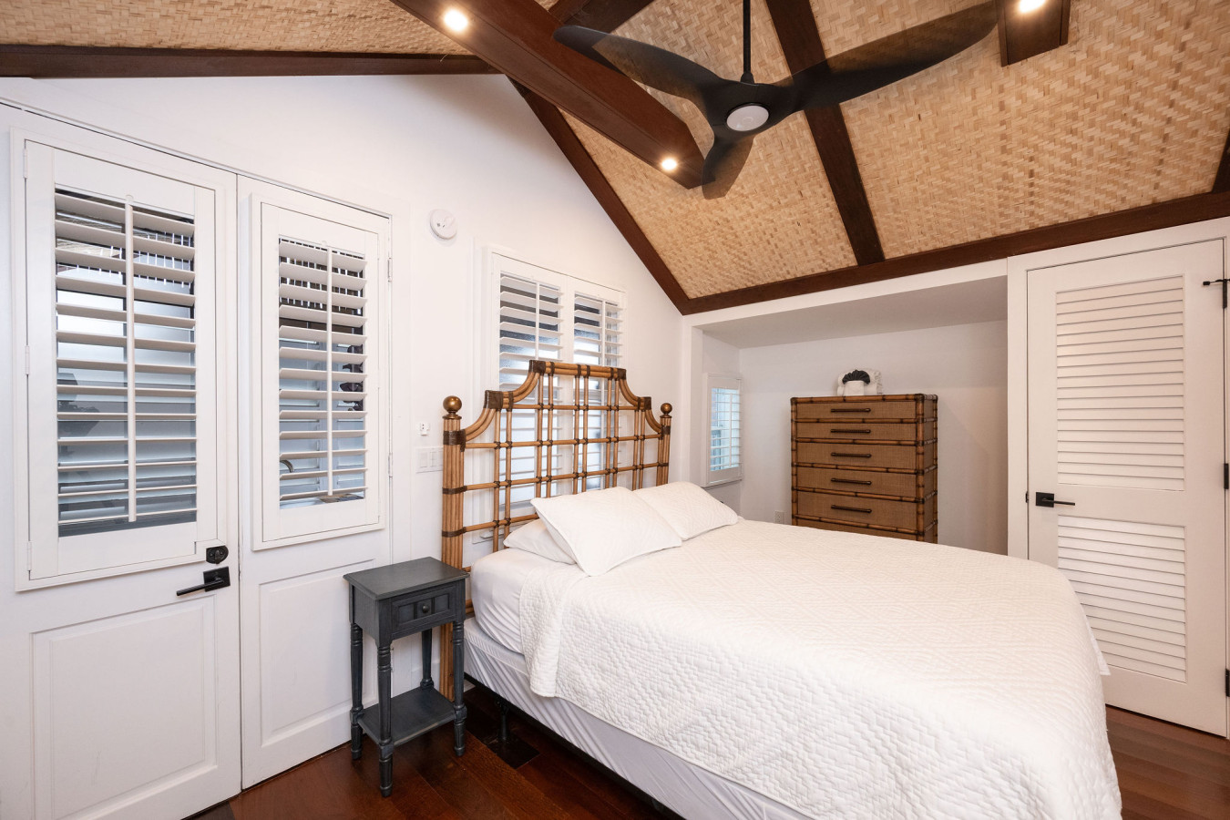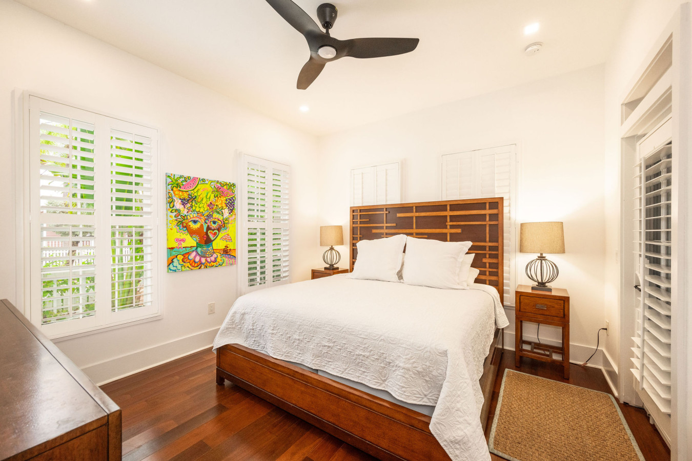 Bedroom Two: Directly across the hall from bedroom one, the second bedroom is furnished with modern walnut tone furnishings. A platform queen size bed, featuring an abstract headboard, sits as a center piece in the bright white room. Matching end tables on either side of the bed, and a bureau complete the set. Plantation shutters on the four tall sash windows add to the minimalist island style. An exterior door to the left of the bed, leads to the bathing porch.