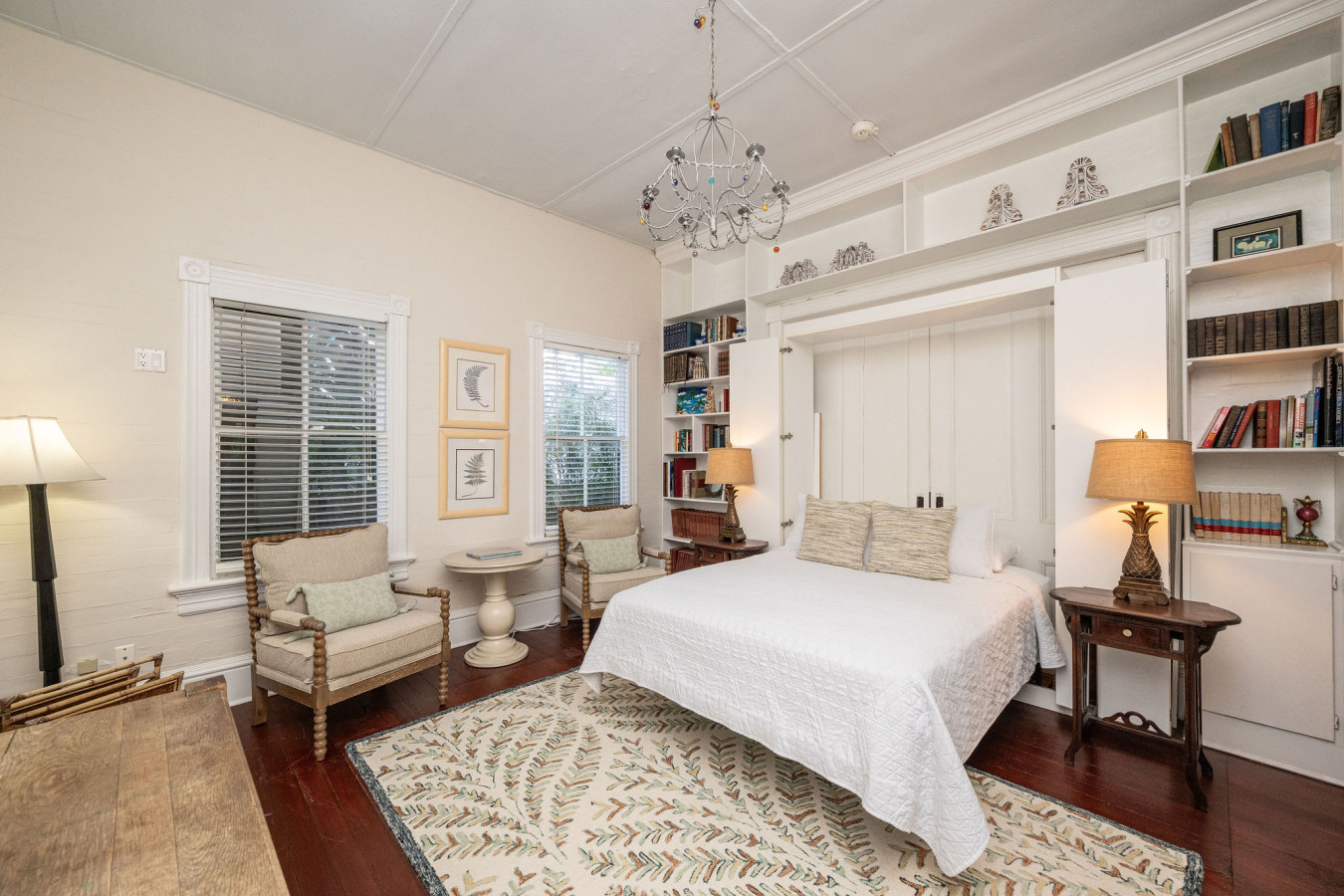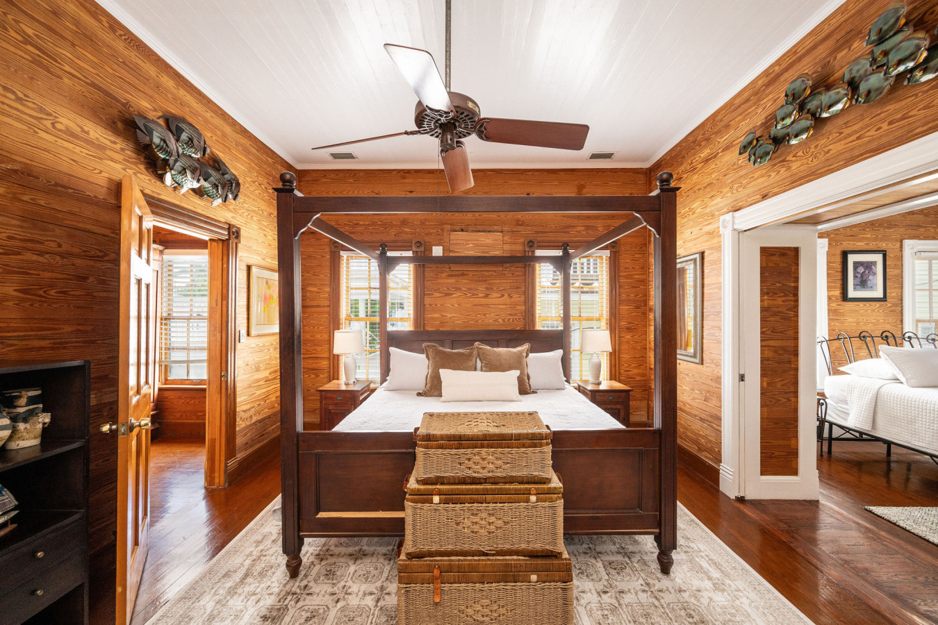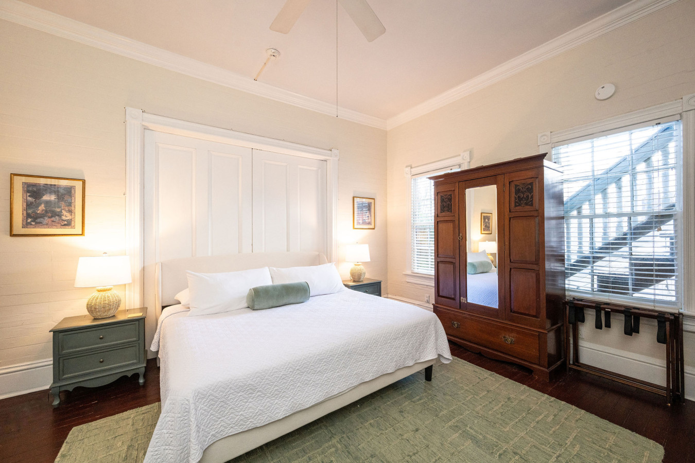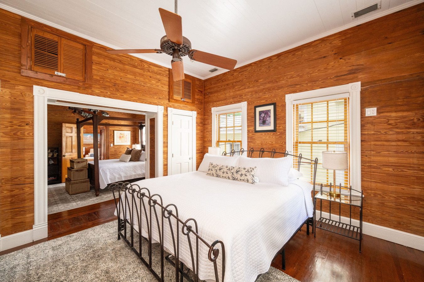Bedroom Two: Directly across the hall from bedroom one, the second bedroom is furnished with modern walnut tone furnishings. A platform queen size bed, featuring an abstract headboard, sits as a center piece in the bright white room. Matching end tables on either side of the bed, and a bureau complete the set. Plantation shutters on the four tall sash windows add to the minimalist island style. An exterior door to the left of the bed, leads to the bathing porch.