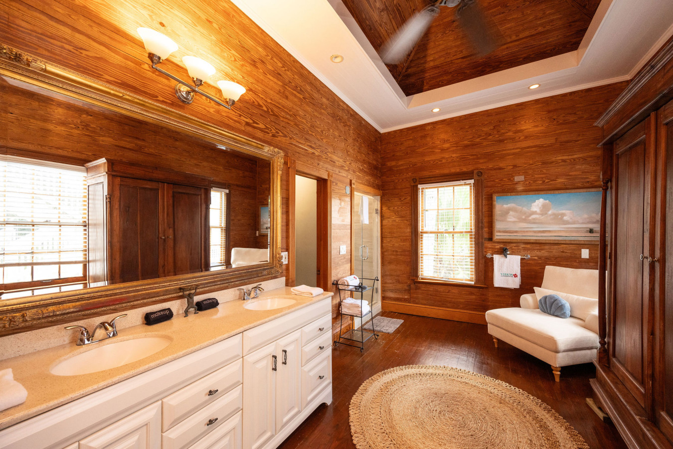 Exotic Bathing Porch: The Caribbean-style outdoor covered bathing porch is a fabulous feature of the house. Here you enjoy an exotic bathing setting for two – with two deep clawfoot bathtubs surrounded by louvered plantation shutters. If you prefer to shower instead, there is an open shower at the end of the bathing room. The bamboo ceiling is carried to the bathing room, and louvered walls provide plenty of privacy. Hanging orchids and potted palm trees punctuate the tropical design.