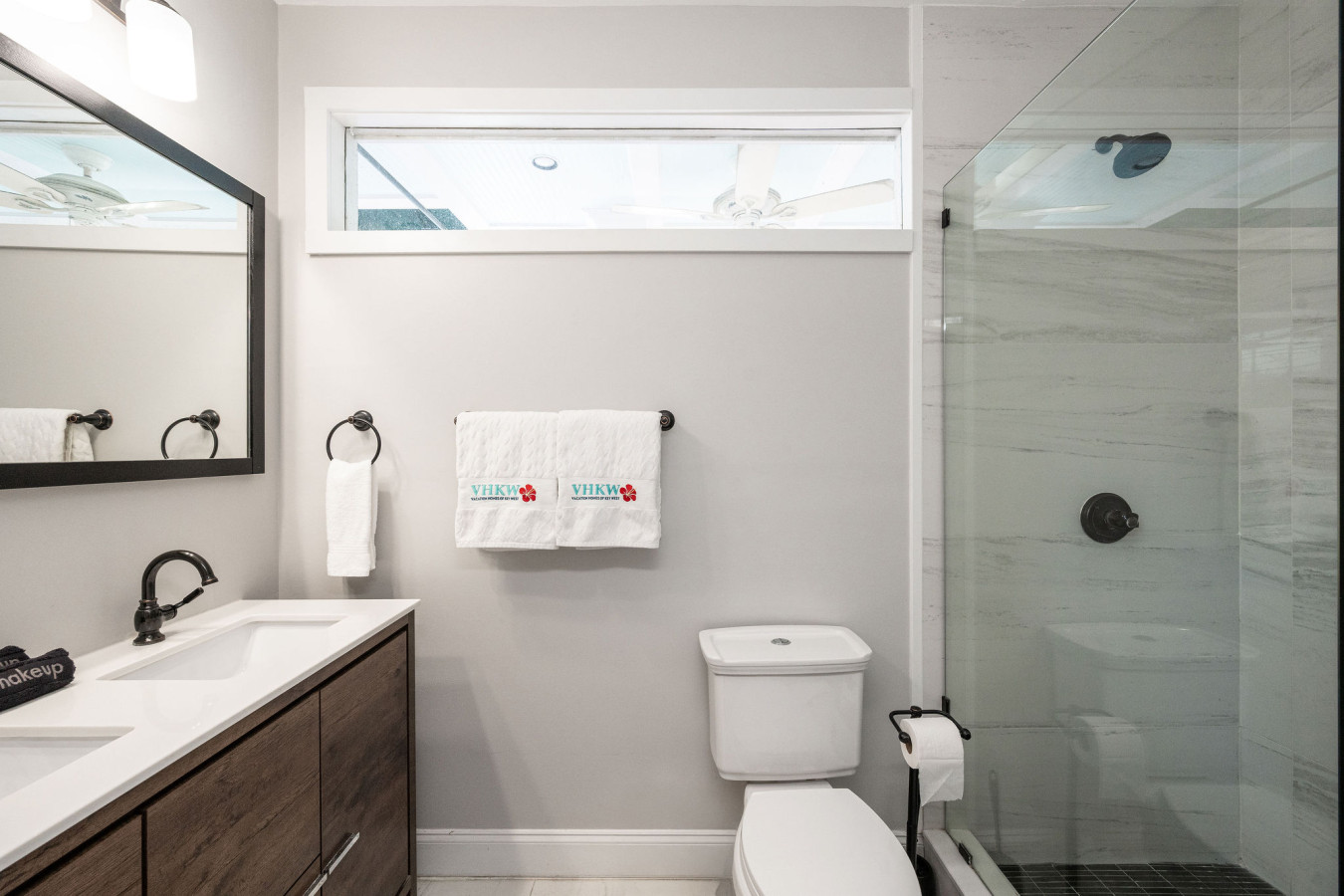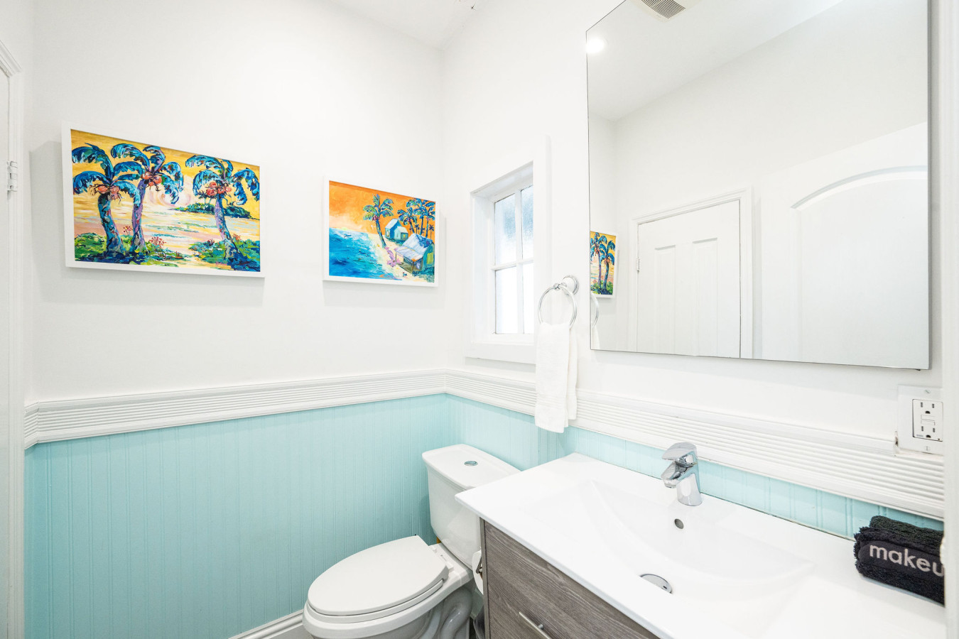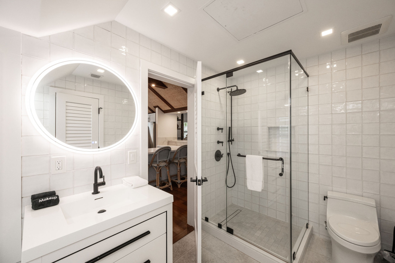 Leaving the great room, an L-shape hallway leads to the three bedrooms and two bathrooms. All bathrooms are elegant. The first bathroom is close to the main entrance door. Decorated in bright white with black fixtures, it offers a deep oval-shaped bathtub and a single vanity sink with three drawers. An oval mirror above the sink reflects the nature light that streams in from the three windows above the bathtub.