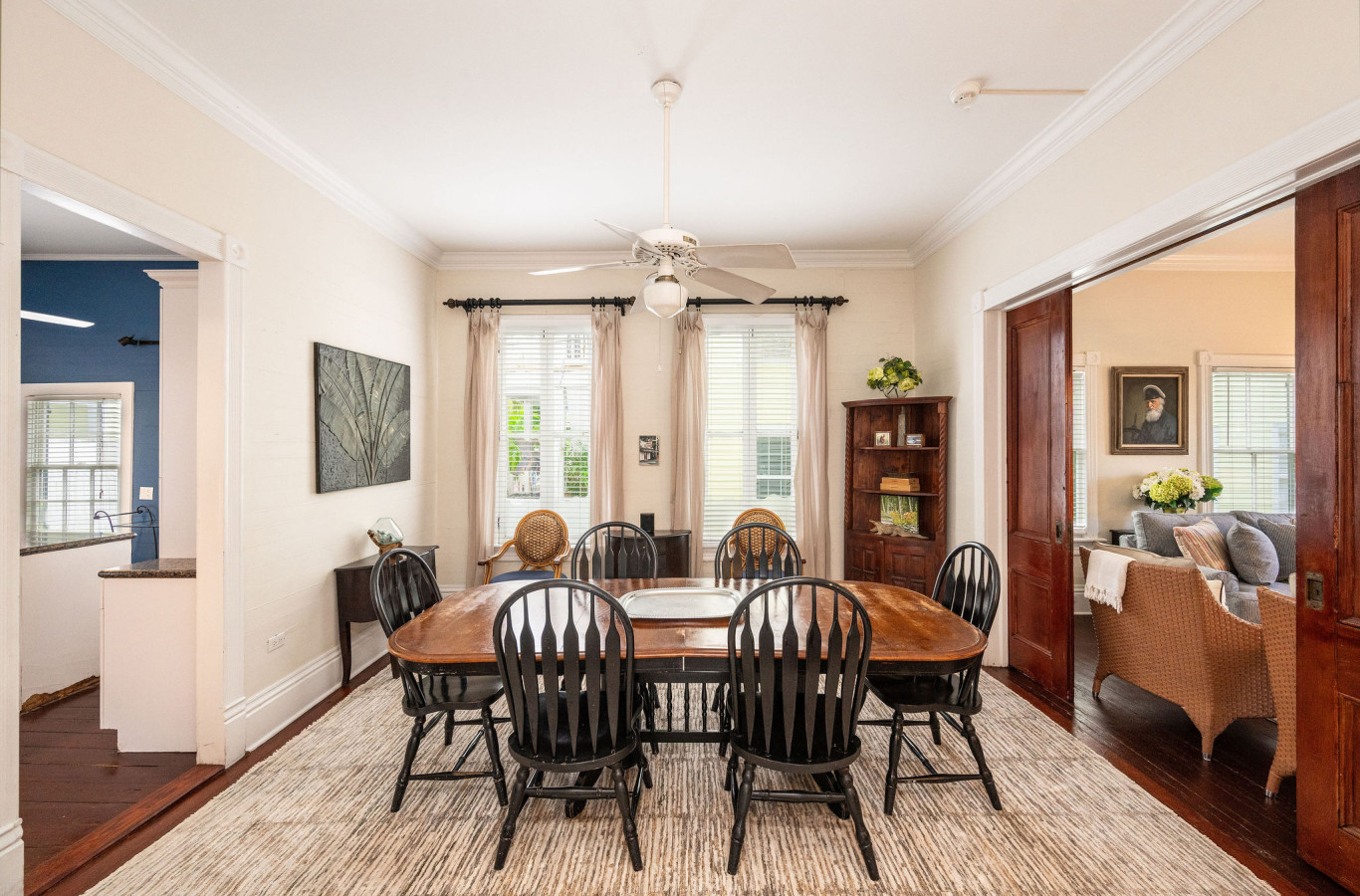 Located at the front of the property, the 7BR 5.5BA Classic Key West Estate is the perfect place for your group to gather. For a full description of this 2-story Victorian home, please follow this link. The common rooms on the 1st floor provide a spacious living room / media / dining room that connects with a renovated blue and white kitchen with stainless steel appliances and earth-tone granite countertops.