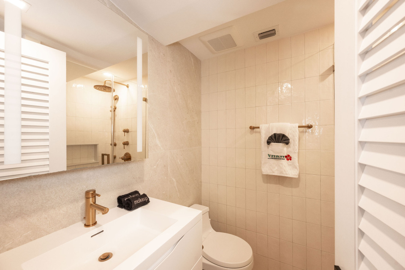 Directly across the hallway from bedroom one, a modern design bathroom is finished in white-on-white tile and marble. The single vanity is topped with a molded sink. The shower is oversized with a rain shower and a wand – all bathroom fixtures are an elegant gold tone.