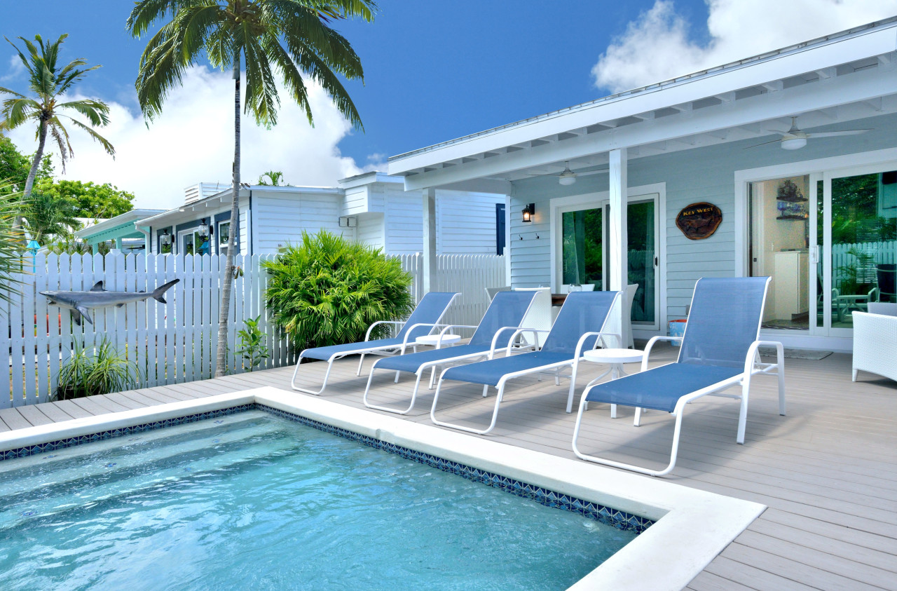 This stylish vintage house, On Hemingway’s Rounds, is listed on the Key West National Register of Historic Places, as being originally built sometime between 1914 – 1926. Today it stands as an inspired renovation of a classic ‘American Bungalow’ redone Key West style.Perfectly redesigned inside, from top-to-bottom, to offer upscale fixtures and amenities plus luxurious outdoor living. Staying with historic guidelines, the street side and front porch remain true to the original casual craftsman form. But the interior now boasts an elegant simplicity and artful décor that meets even the most discerning of contemporary tastes. The result is a new design that includes upscale amenities inside and a spacious minimalist outdoor poolside scene in the back.