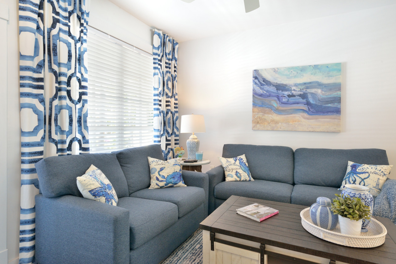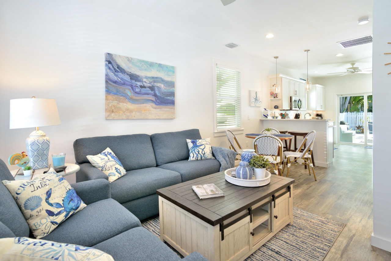 Great Room: Renovated to create an open-concept lifestyle, the spacious great room runs from the front door to the back of the house. The floor plan is staged with the living room at the front of the house. A corner furniture grouping features a coastal denim sofa and matching love seat, plus a wainscoting coffee table, large enough to put together a puzzle or play a board game. A 55″ flat-screen TV is mounted on the wall opposite to sofa for easy viewing.
