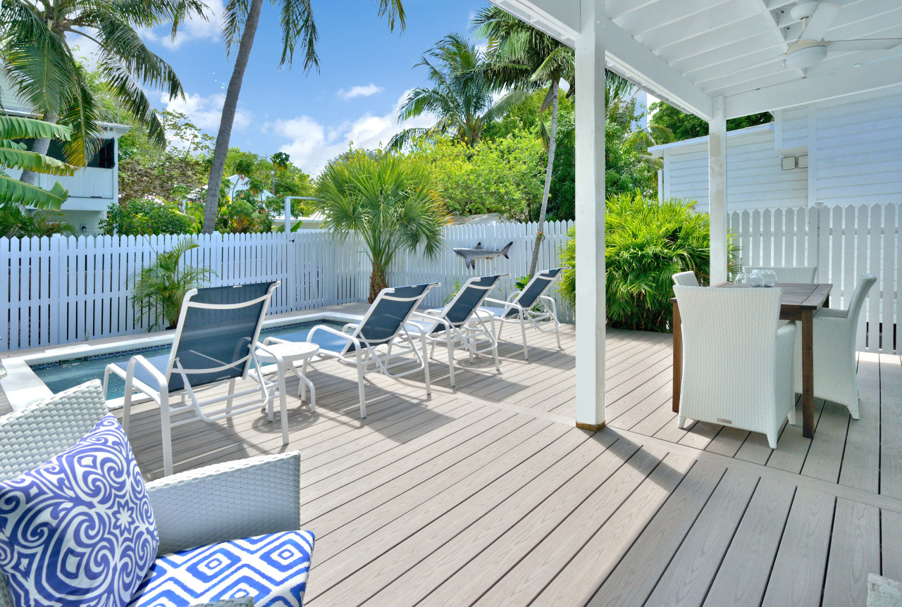 Tropical landscaping and a paver-path wrap around the house to the completely fenced back of the property. Here we discover a minimalist garden paradise with a large wood composite deck, swimming pool, and select tropical plantings. Tanning chaises on the sun deck, plus a dining table and seating under an expansive covered deck, create a fabulous contemporary outdoor lounge. Grab the paper or a copy of ‘Old Man in the Sea,’ and some coffee and you just might end up staying here the entire morning.