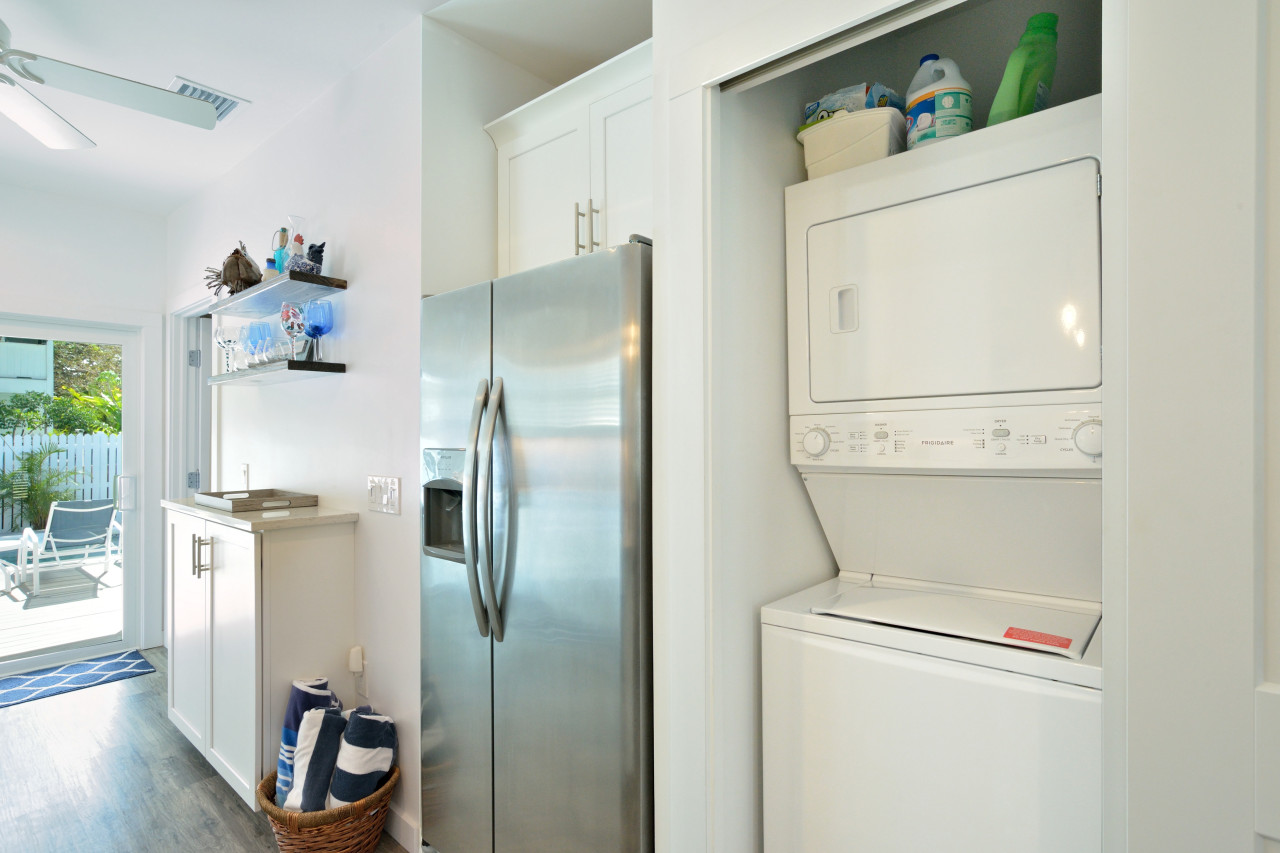 The kitchen encompasses the entire back of the great room. A double-level breakfast bar, towards the middle of the room creates a spatial division between the dining and living room areas, making it easy to serve snacks and drinks. Everything sparkles from top-to-bottom – from the bright-white cabinets to the white marble counter tops, to the stainless-steel appliances. For a sit-down meal, there is a round French bistro wicker and rattan dining table with a glass tabletop and four matching dining chairs.A laundry and housekeeping closet, with a stackable washer and dryer, are conveniently hidden next to the refrigerator.