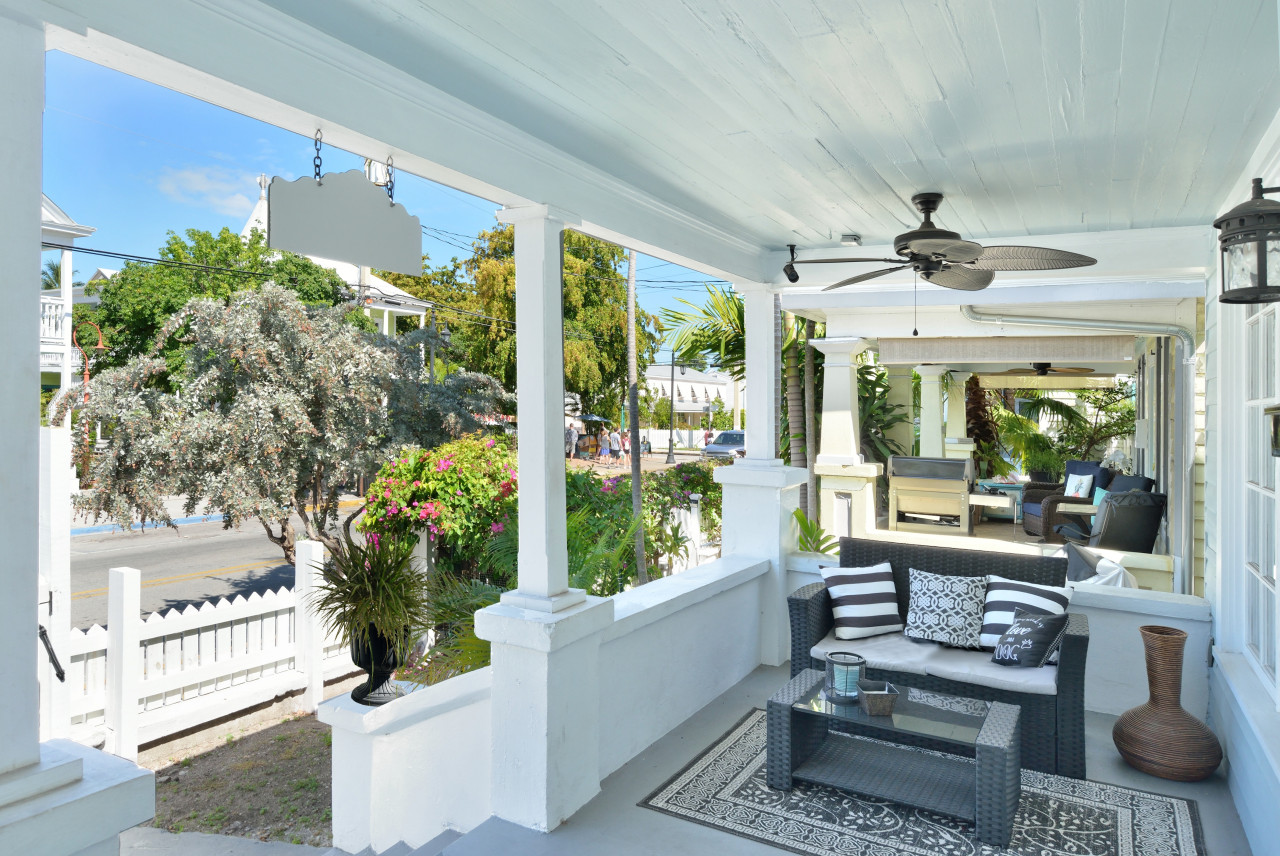 We begin our tour at the front of the house from Whitehead Street. It’s situated in a perfect little urban row of charming late 1920’s and 1930’s island bungalows. The picturesque curb appeal is both welcoming and somehow reassuring that life was and still is good.A short white picket fence anchored on an art deco concrete wall, makes the entrance to the tropical front garden. The wide front porch, with concrete columns with capital posts is genuinely charming. Furnished as a sitting room with a contemporary loveseat on one side and two matching chairs on the other, this is your perfect place to watch the world of Key West go by. The porch sits just enough back off the street that you can sit and observe this main street in the downtown Old Town Key West neighborhood in privacy.