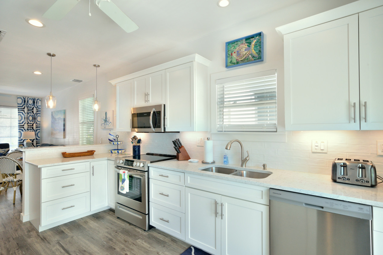 Every room is very nicely laid out with unique and comfortable furnishings, and imaginative island-theme artwork. Multiple windows and sliding glass doors invite in the sunlight. Recessed lighting in tall ceilings and designer pendant lights over the breakfast bar, bounce around the light at night. A harmonious blue and white color pallet is used throughout the home for furnishings, wall paint and artwork. A combination of distressed and finished wood furnishings are blended with wicker and natural seagrass textural pieces to create a natural and sophisticated island ambience.