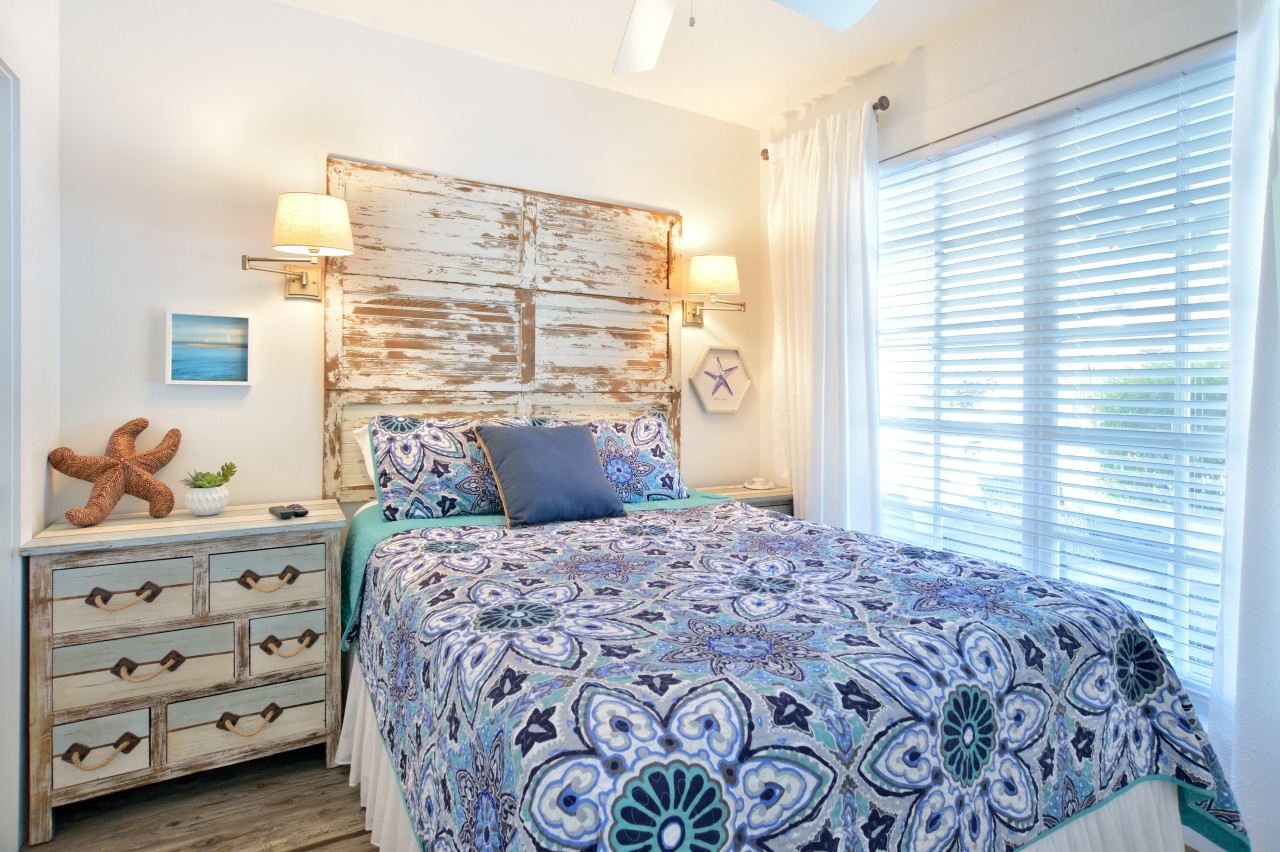 Front Bedroom: Standing at the front entrance of the house, the first door on the right leads to the front bedroom. This bedroom features a whimsical color-washed furniture ensemble. An extra-tall whitewashed wooden headboard is paired with a contrasting blue and whitewashed dresser. Matching swing arm lamps hung for reading on either side of the queen size bed, add an elegant touch. Beach theme artwork creates a cozy Caribbean ambience. A 50″ flat screen TV is hung on the wall opposite the bed for easy viewing.