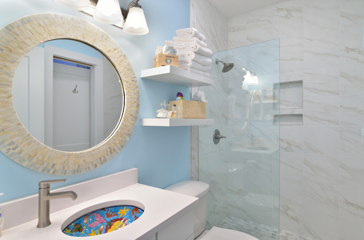 Double pane windows on the exterior wall bring in plenty of natural daylight. On the opposite wall, a door connects to a fanciful yet elegant en-suite bathroom. Whimsy is carried into the bathroom with a brightly colored sea-theme handmade pottery sink. In a softening contrast, remaining fixtures are shades of white on white. A round vanity mirror with an abalone shell frame adds a stunning touch. An elegant double size shower is finished with white faux marble tile and a pane glass shower curtain. For convenience, this bathroom also has a 2nd door connecting with the front of the great room.