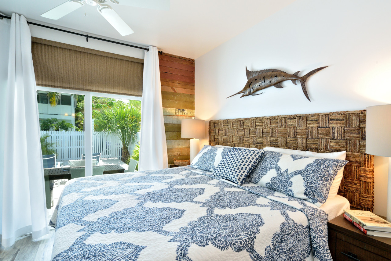 Master Bedroom: Continuing to the back of the house, the last door on the right leads to the master bedroom. The décor is imaginative, handsome, and delightfully Hemingwayesque in style. A unique feature here is the exterior wall – the owners decided to preserve the original wood installed when the house was built using scrap wood and signs (look for the sign with date 1908) ! A king size bed with handwoven seagrass headboard is flanked by rustic wooden bedside tables with wrought iron handles. White ceramic reading lamps are placed as an elegant contrast to the rustic wood. A gorgeous Atlantic blue marlin is prominently displayed over the headboard. Opposite the bed, a dark-wood bureau is reminiscent of an antique writer’s credenza. A 50” flat screen TV is mounted on the wall above the bureau.
