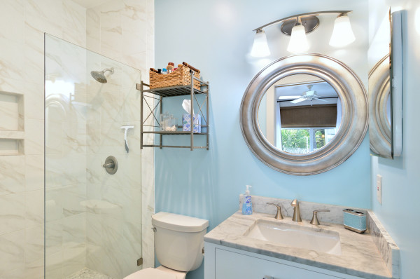 The master en-suite bathroom is elegant and refined in contrast to the rustic bedroom touches. A white marble vanity with brushed chrome fixtures tops the undermounted white porcelain sink. A round vanity mirror with a brushed chrome frame and arch vanity light are exquisite set against the blue painted wall. The double size shower is finished with a white faux marble tile and a pane glass shower curtain – same as the front bathroom.