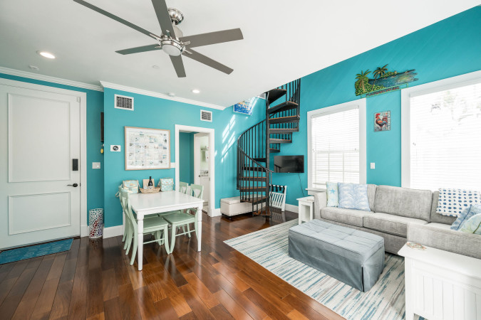 The interior is modern, classical, and island style all at the same time. Festive Caribbean blue walls throughout are contrasted with bright white trim. Ocean themed artwork adds to the tropical Island vibe. A distinctive black metal staircase, with wooden risers, joins the two levels of the condominium. The first level accommodates the living room /kitchen/dining spaces, and one full bathroom. Level two is soley reserved for the master bedroom suite.