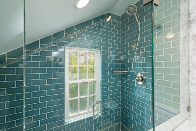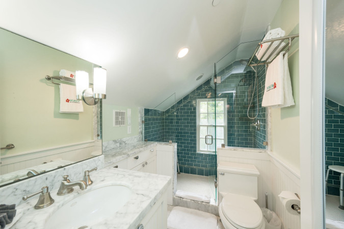 The full-size master bathroom is stunning with a double size shower with indigo jewel tone tiles and frameless glass doors. The white marble vanity top is extended out past the sink, to create additional counter and drawer space for personal items. A fanciful feature is the sash window in the shower that frames a picturesque treetop view. Between the window, ceiling, and vanity lights, the space is perfectly lit.