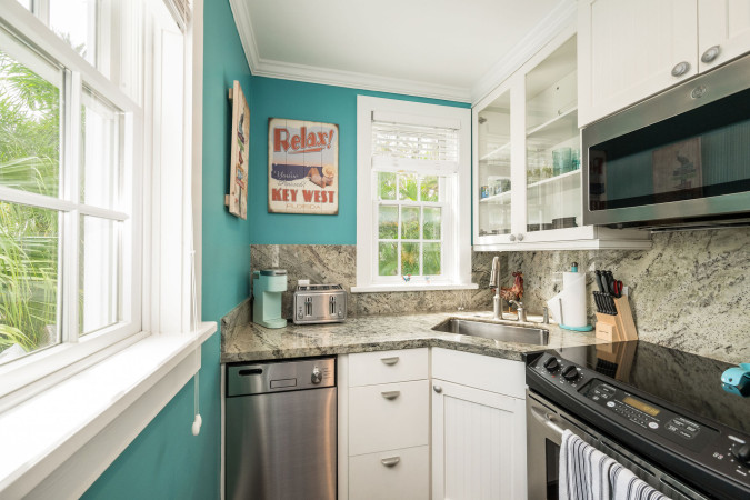 Steps from the sofa, a doorless entrance leads to the U-Shape kitchen. Built-out with granite counter tops and white cottage style cabinets, the kitchen provides upscale stainless-steel appliances. It’s equipped to do some serious cooking, but a playful sign on the wall reminds you too, Relax, You’re in Key West! Two kitchen windows invite in the sunlight and provide pleasing views, including the outdoor private back deck.