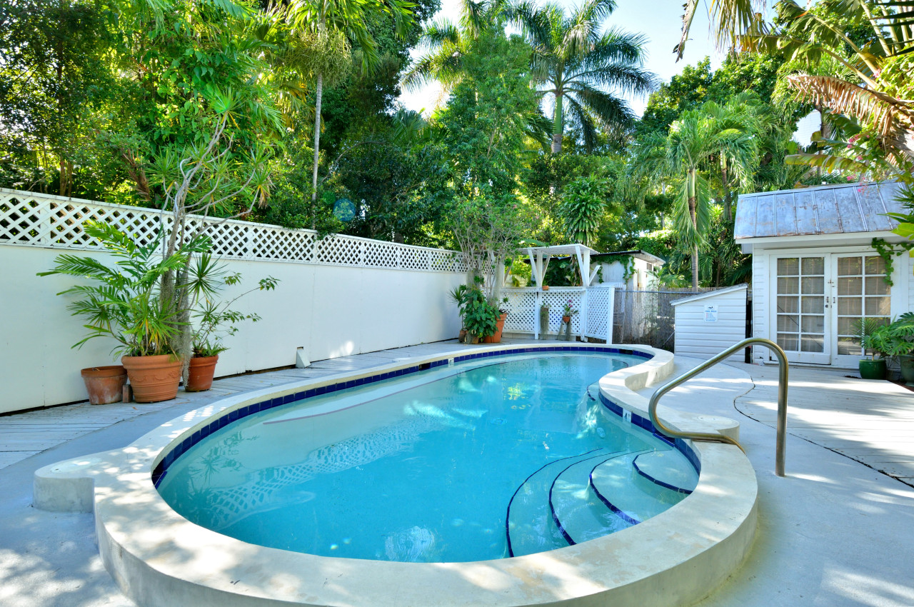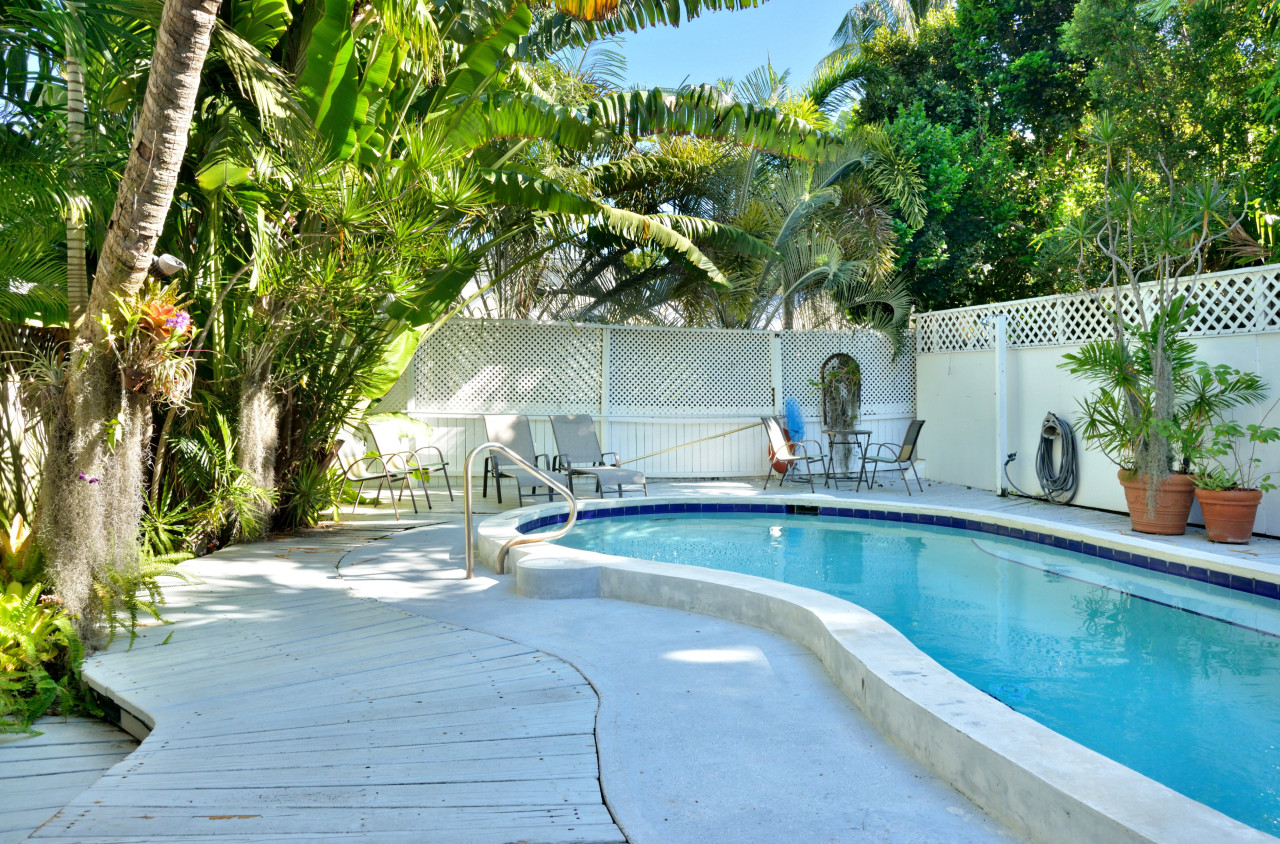 Behind the building lies a lushly landscaped, fully fenced shared pool area. The kidney-shaped pool is surrounded by a sunny deck, loungers, and mature tropical foliage that provides privacy and shade. A shared laundry cottage is tucked at the rear of the property.