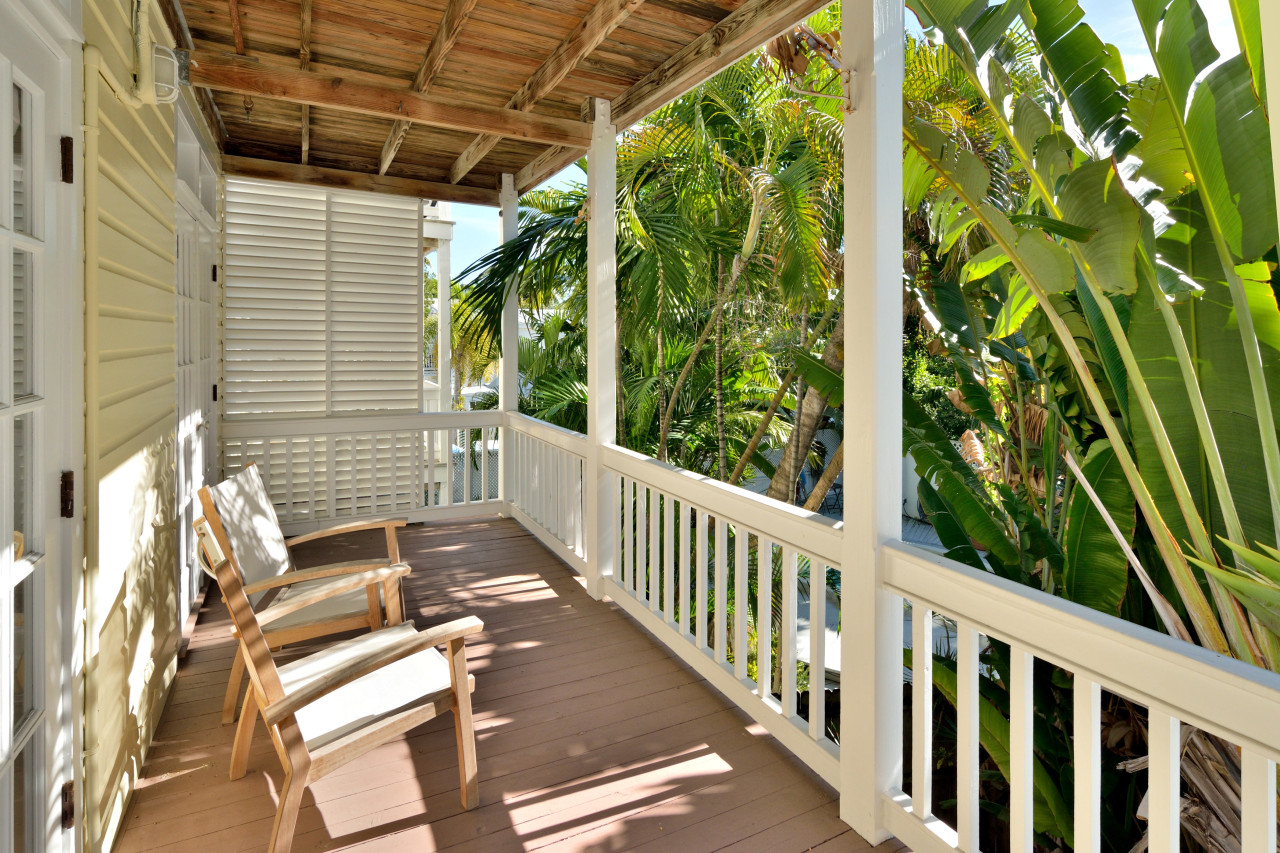 - A deep, covered upstairs porch accessible from both bedrooms, offering serene garden and pool views