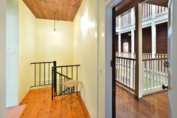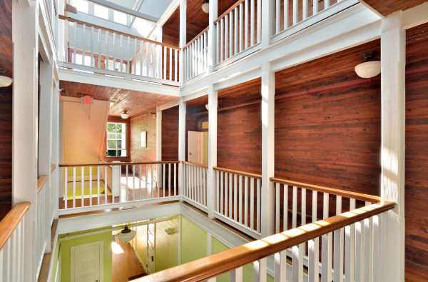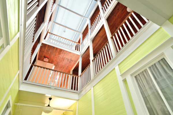A major renovation in 1980 transformed the structure into private residences while retaining its architectural integrity. The redesign introduced wide, covered porches on the upper levels, enhancing both the building’s appearance and the indoor-outdoor lifestyle. The atrium stairwell, with its 6-foot wide wood-paneled staircase rising three stories to a skylit ceiling, remains the centerpiece—a stunning architectural gem.
