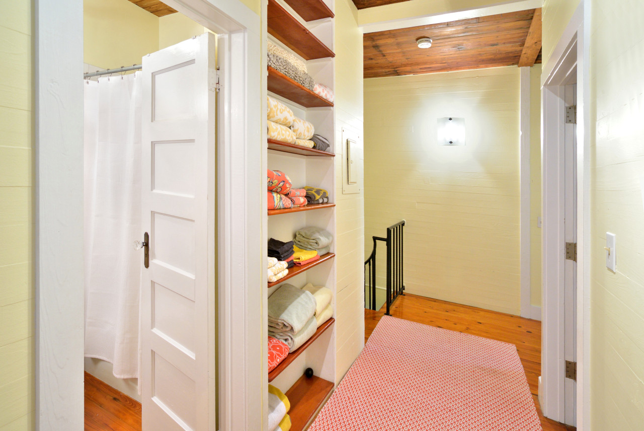 - Shared full bath with tiled shower/tub combo, vintage-style vanity, and exposed pine walls
