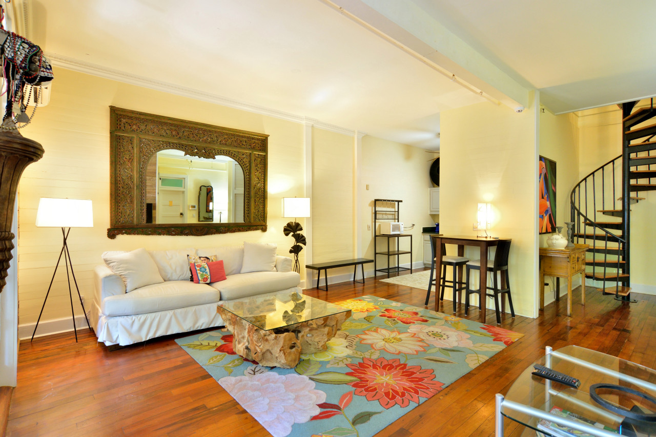 The condo spans two stories and can be accessed from both levels-via the main entrance on the ground floor or through the 2nd-floor atrium stairwell. A stylish spiral staircase also connects both floors internally, adding to the eclectic character.
