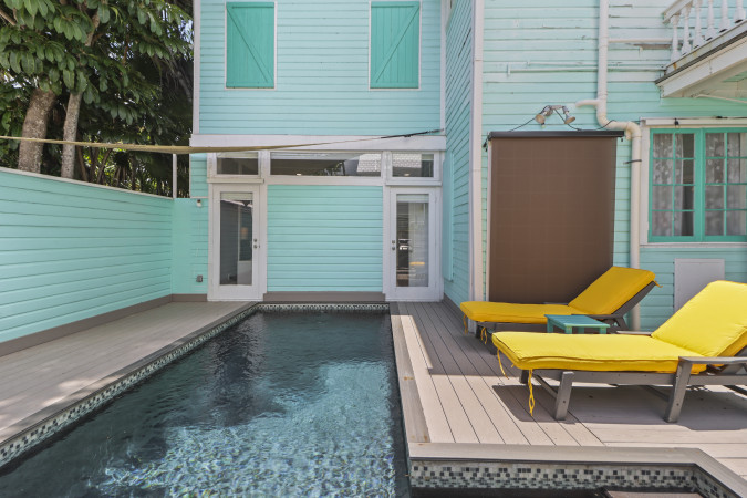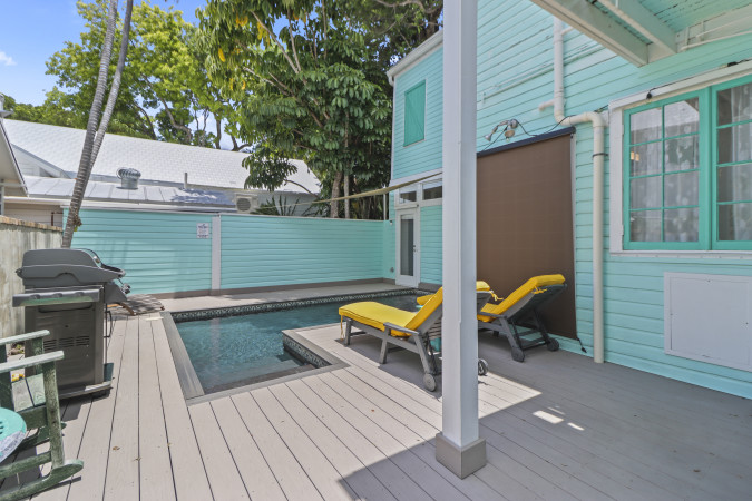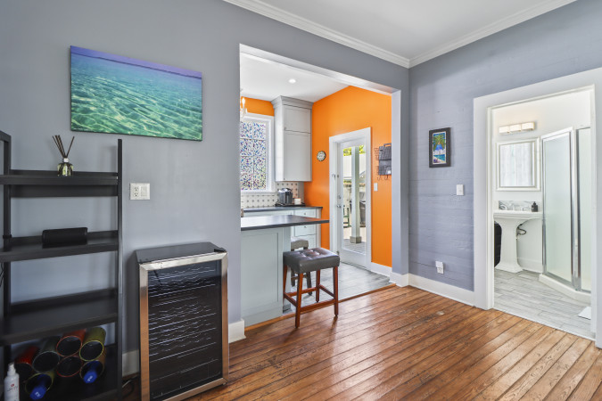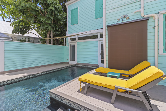 The unit itself shines with fun color and vaulted, sunlit interiors. Rocking chairs await you on the front porch, and a sparkling private pool and grill are all yours to enjoy out back. The vibrant citrus orange kitchen is as energizing as a Cuban coffee, and comes fully equipped with a stainless steel refrigerator/freezer and all the cooking essentials. Gather around the dining table for a homemade meal or favorite Key West take-out, then mix a drink under the neon cocktail sign at your personal mini bar.