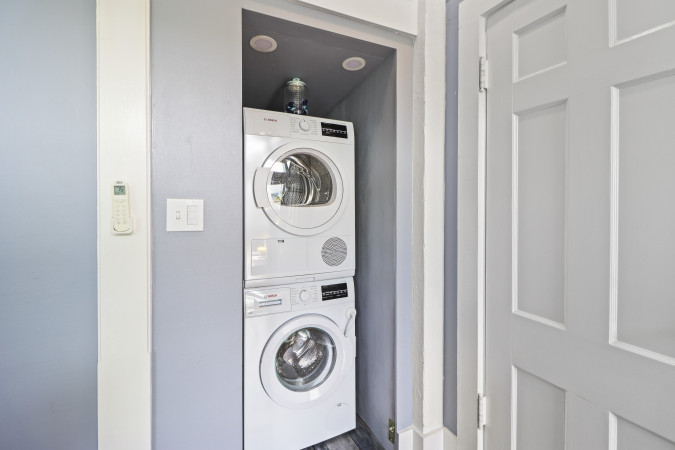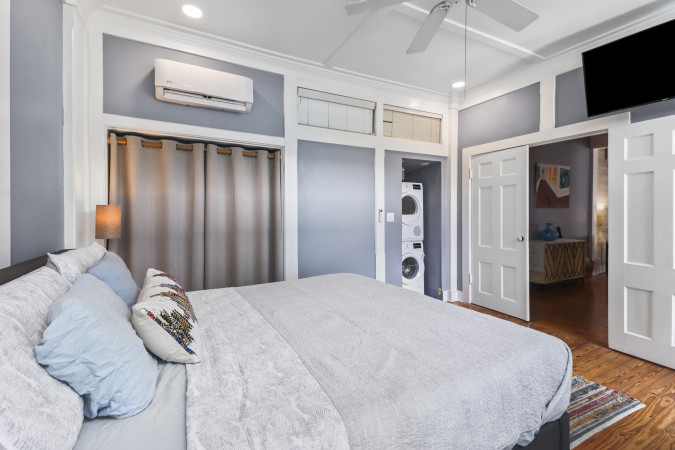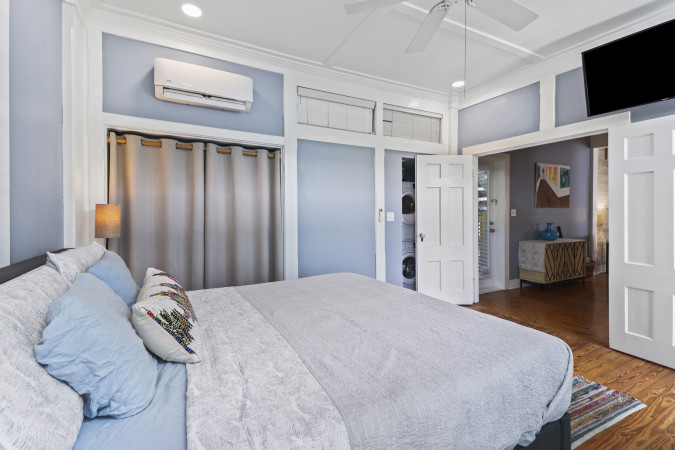 The open living room is airy and easygoing, with a comfy pull-out sofa ready for weekend visitors or kids tagging along on a longer stay. On either side of the living space, you’ll find two king bedrooms, each designed for maximum comfort and reprieve. Both feature plush king-sized beds, smart TVs, closets, and split-unit ACs to personalize your climate control. The primary suite has immediate access to the pool deck and a sun-drenched en-suite bath. Another full bath is available to the other bedroom and common area.