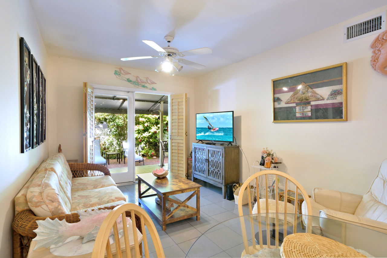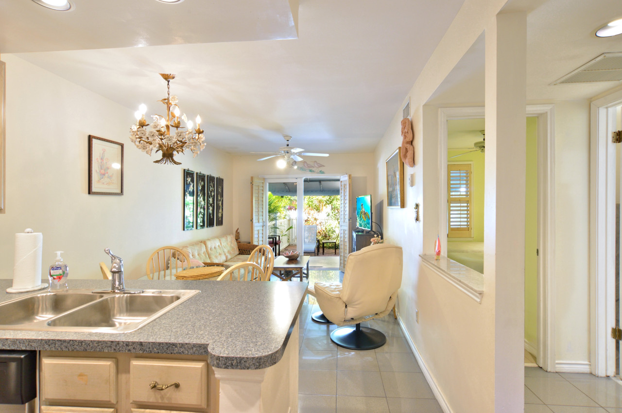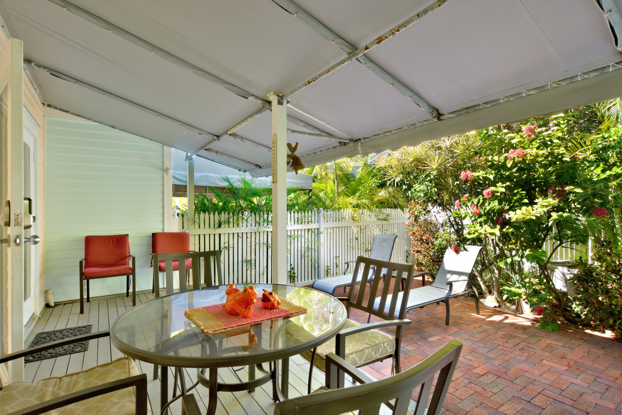 One of the nicest features of this garden flat, is the generous covered back porch, that creates an enviable spot for the famous Key West indoor-outdoor lifestyle. Access this outdoor room through the single-pane French doors off the living room. Here you find an outside dining set and plenty of extra chairs. Just beyond the porch, is a bricked courtyard, set with chaise lounges for horizontal relaxation. The view from your courtyard is landscaped grounds, steps from the shared swimming pool and cabana.