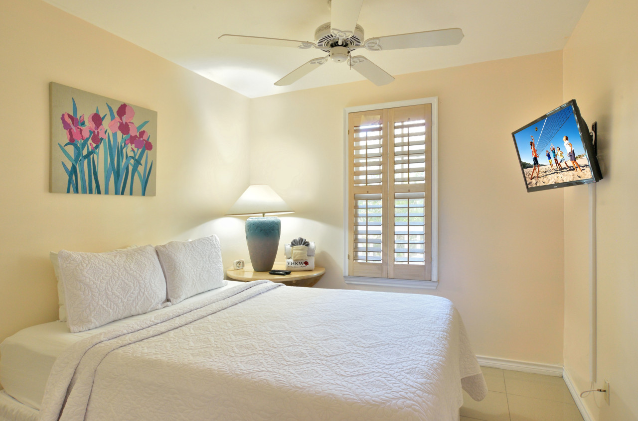 The bedrooms are on opposite sides of the bathroom. Both bedrooms provide 32-inch wall mounted flat screen TV’s, ceiling fans, and plenty of closet space. The master bedroom, which provides a queen size bed, is to the right of the bathroom, as you enter the bedroom hall. With coral-cream walls, a bright blue bedspread, and complimenting bright artwork over the bed.