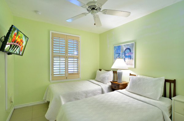 The second bedroom, which provides two twin beds, is to the left of the bathroom. The beds can be pushed together and made up as a king size bed upon request. It’s shown on our slideshow with light wood furniture, soft lime-green walls and tropical theme bedspreads.