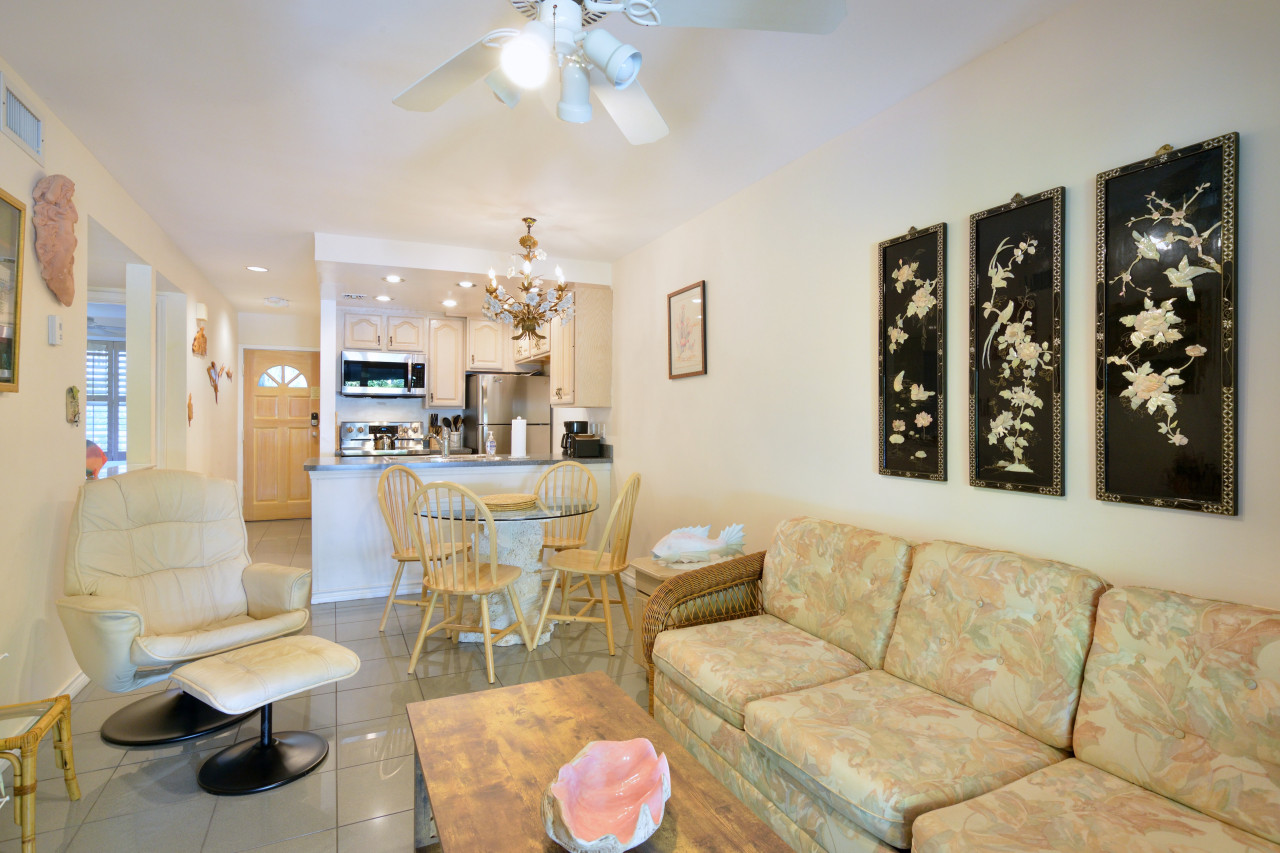 Looking north from the front porch, facing town, you’re less than two blocks from Duval Street. Looking south you’re less than two blocks from the Truman Waterfront Park and Key West Amphitheater. You’re also at the gateway to the iconic pre-Civil war Fort Zachary Taylor, and just a ten-minute walk to the water’s-edge of the beach. But before we explore more of the surrounding grounds, let’s step inside the flat and focus on the layout and amenities, and peek at the covered back porch and courtyard garden.