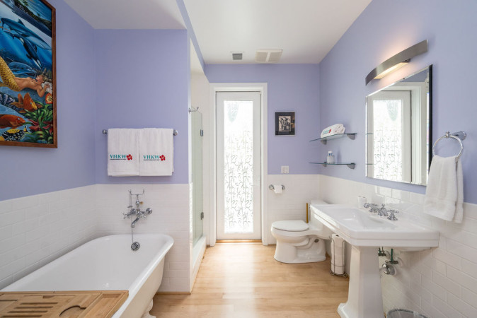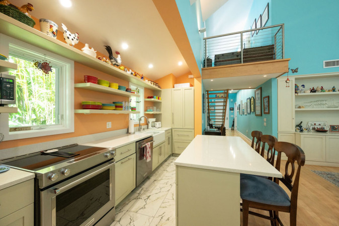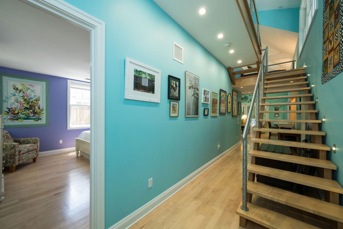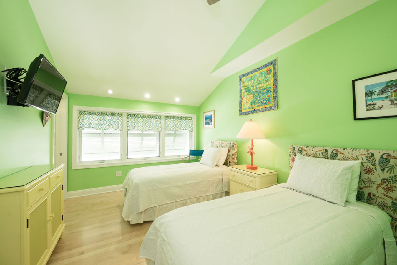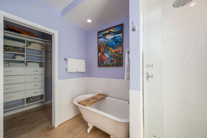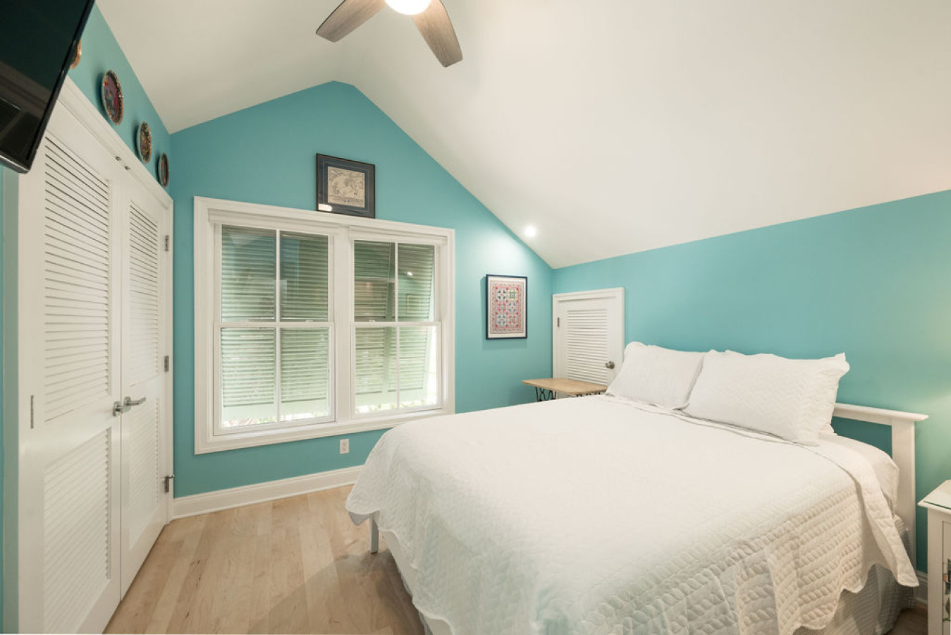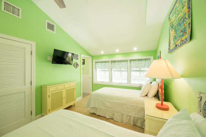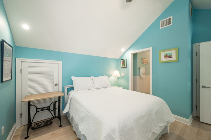 Back inside and up the stairs, you’ll find two more colorful bedrooms, both with their own private, full bathrooms and huge closets. With the vaulted ceilings, happy hues, and skylights, upstairs feels like a jungle treehouse.