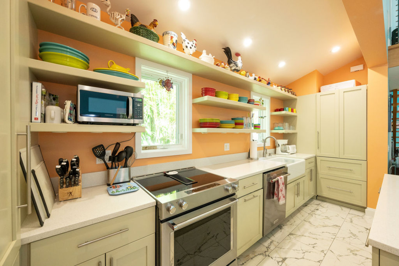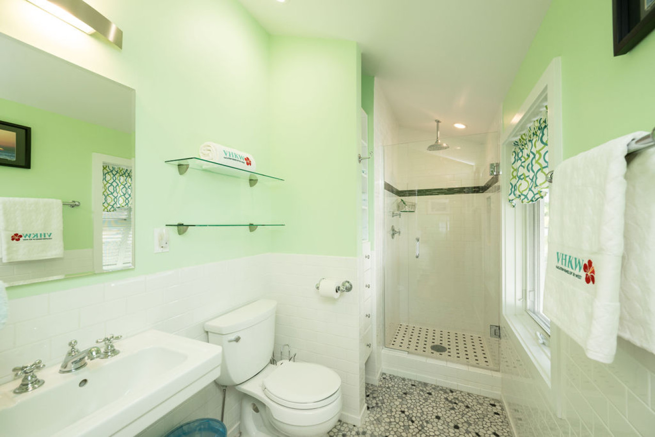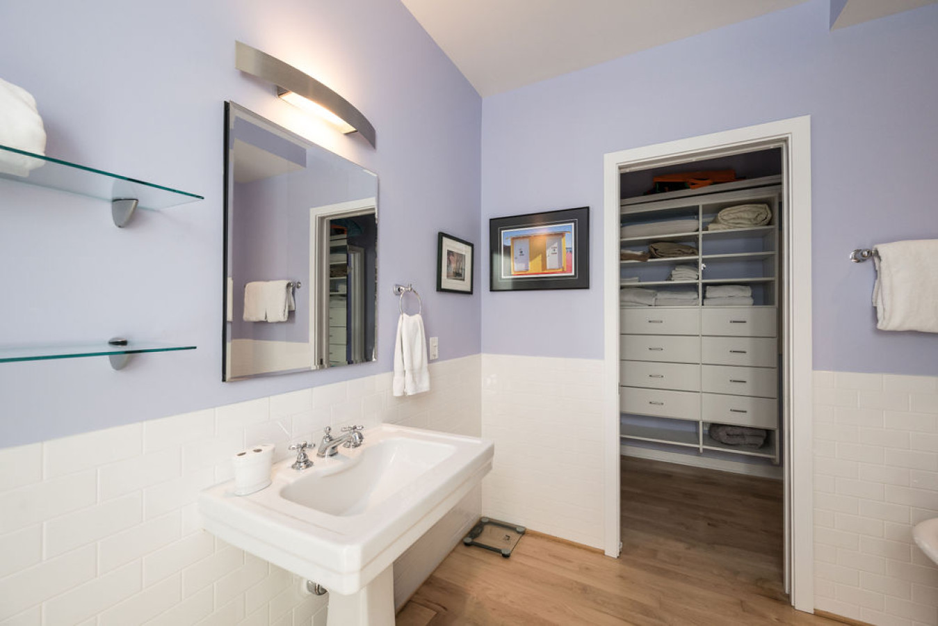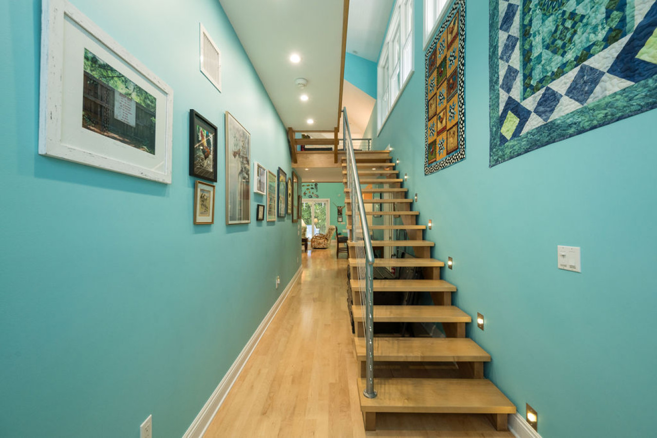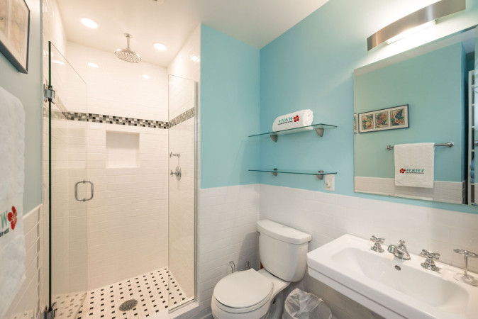 Back inside and up the stairs, you’ll find two more colorful bedrooms, both with their own private, full bathrooms and huge closets. With the vaulted ceilings, happy hues, and skylights, upstairs feels like a jungle treehouse.