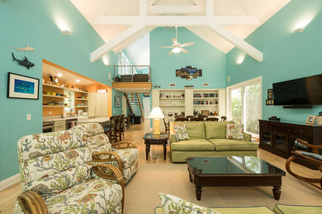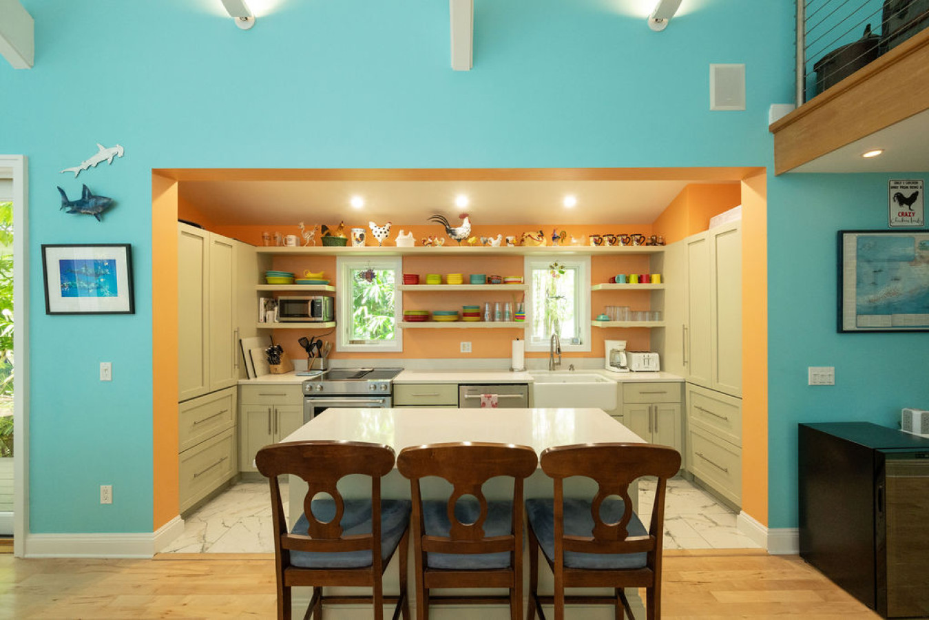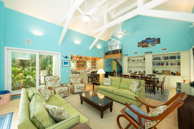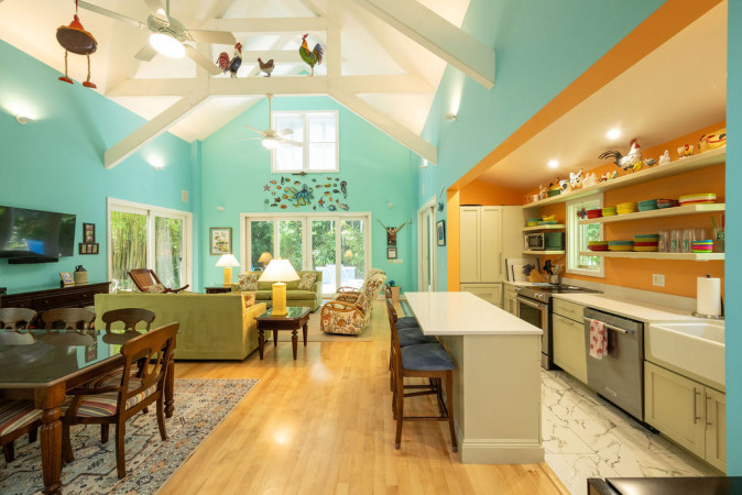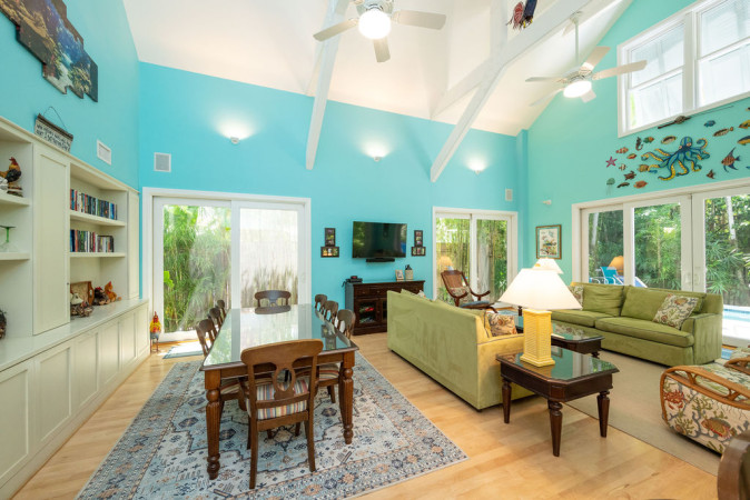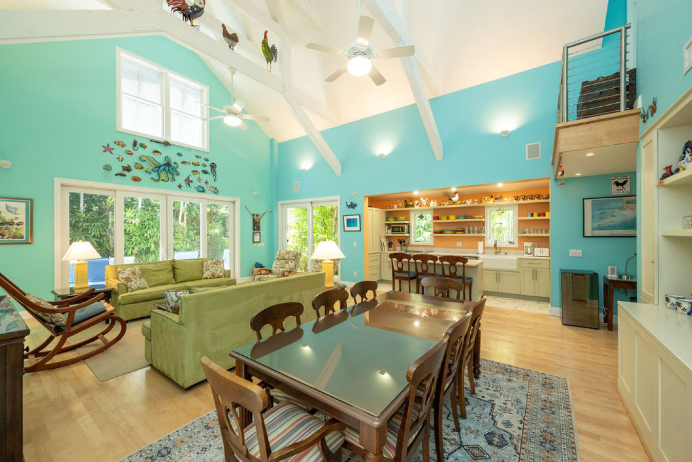A camera roll full of the best family vacation memories is inevitable at The Kaleidoscope House: A Colorful Key West Hideaway. Tucked away on a quiet, foliage-lined street in Old Town, this vibrant tropical retreat is nestled in and amongst the best of Key West. This home is a newer construction, built in 2006, with a big porch, vaulted ceilings, and a calming sage green exterior. Inside, bold and bright design details create a playful yet serene atmosphere, perfect for everything from post-beach, lazy lunch breaks to lively evening get-togethers before you head out on Duval Street.