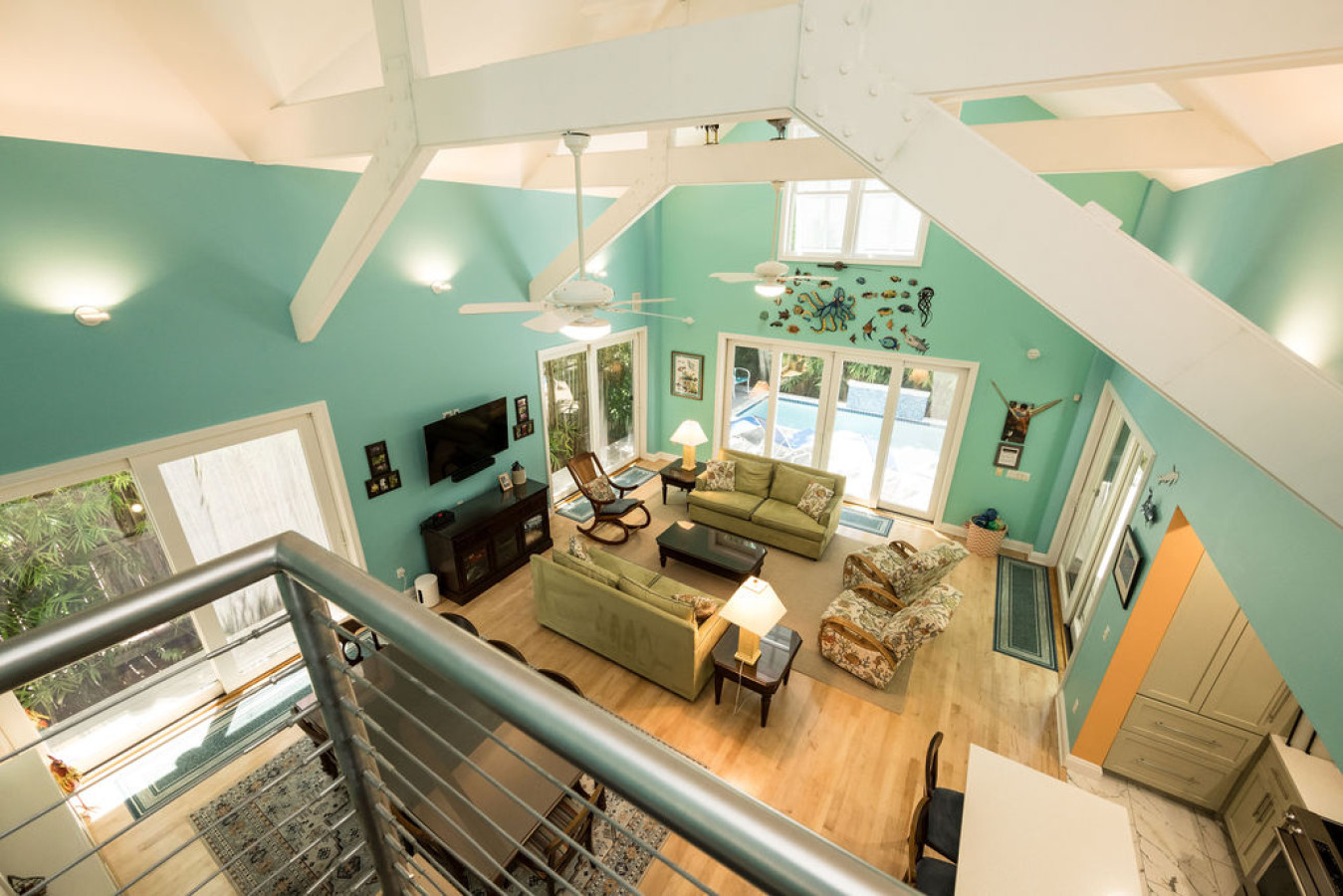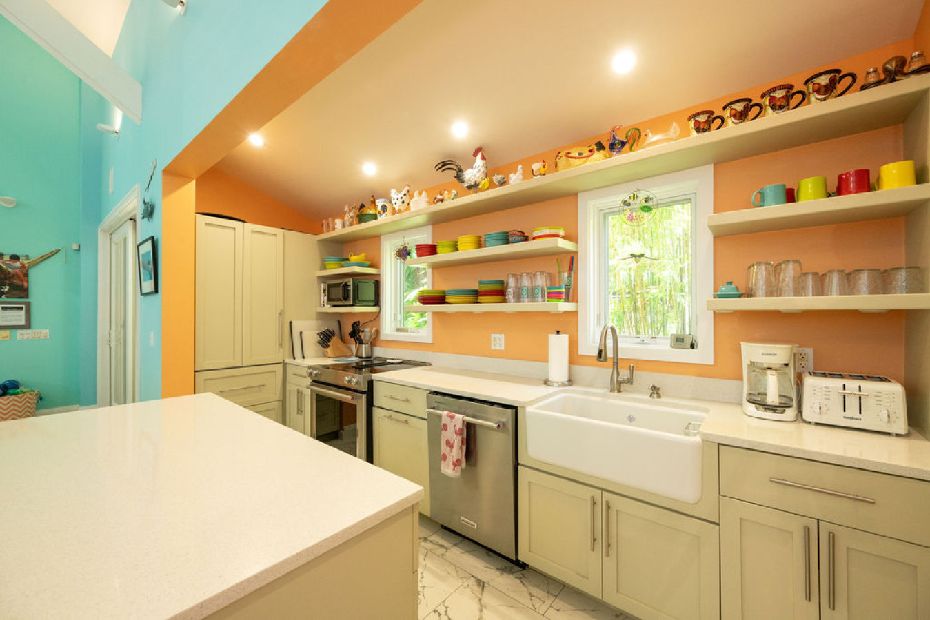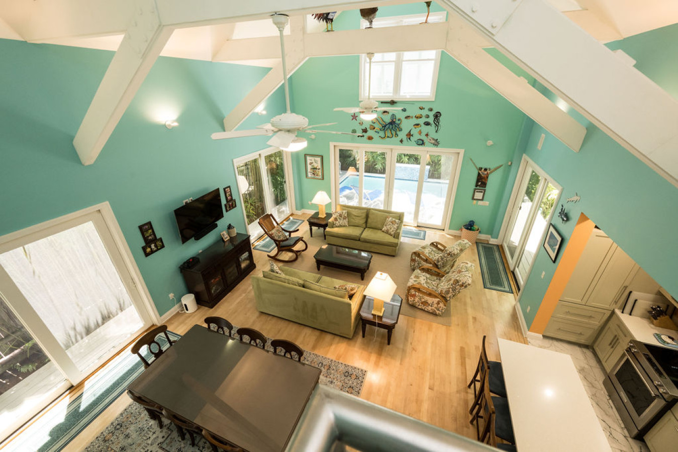 A camera roll full of the best family vacation memories is inevitable at The Kaleidoscope House: A Colorful Key West Hideaway. Tucked away on a quiet, foliage-lined street in Old Town, this vibrant tropical retreat is nestled in and amongst the best of Key West. This home is a newer construction, built in 2006, with a big porch, vaulted ceilings, and a calming sage green exterior. Inside, bold and bright design details create a playful yet serene atmosphere, perfect for everything from post-beach, lazy lunch breaks to lively evening get-togethers before you head out on Duval Street.