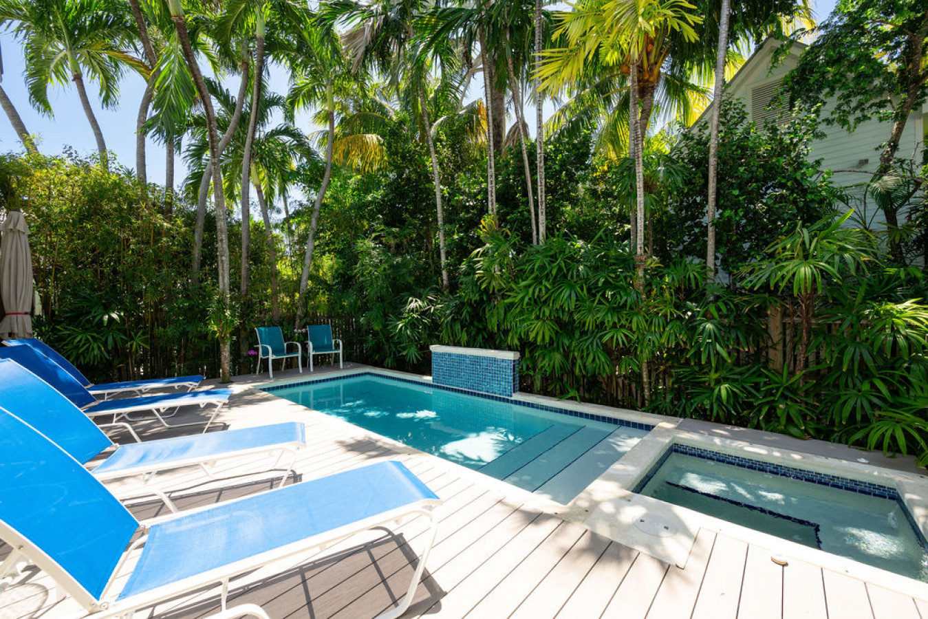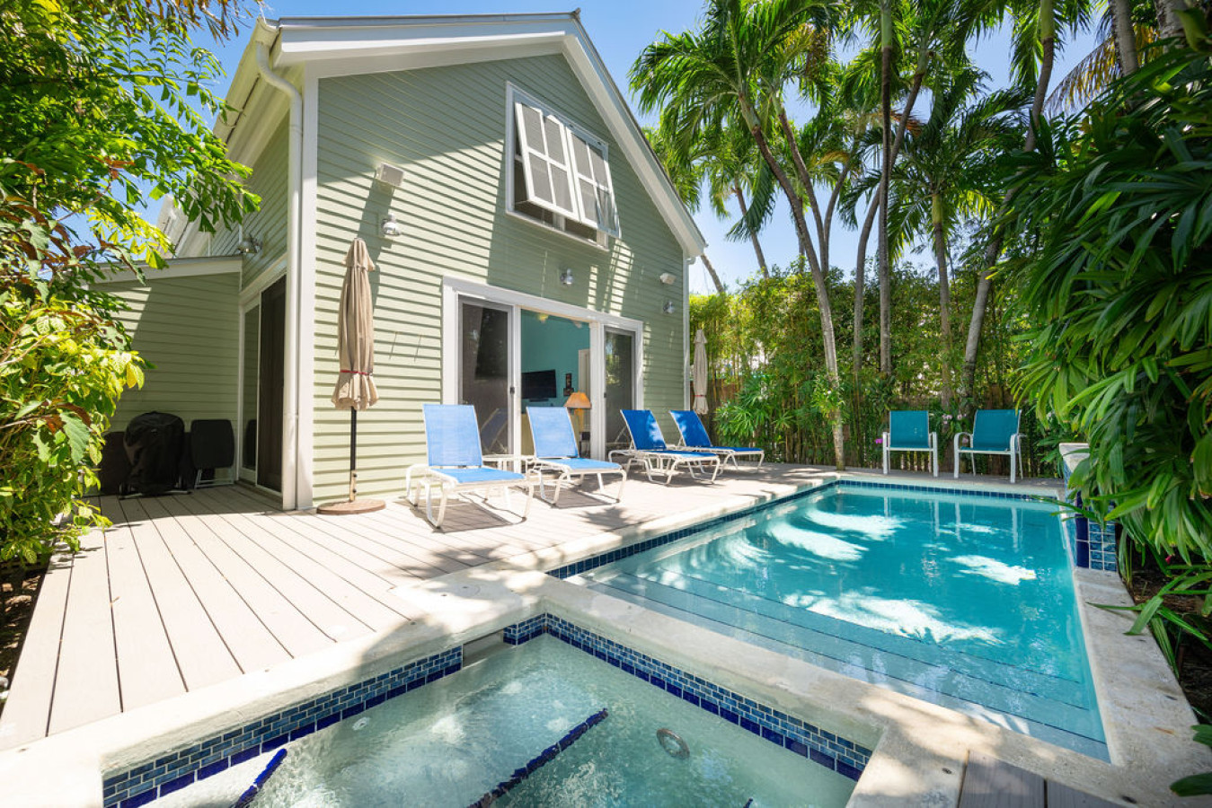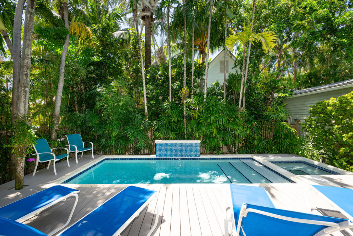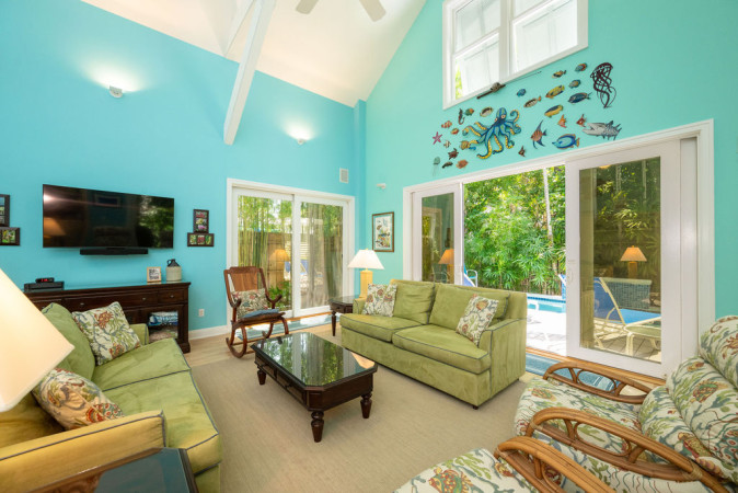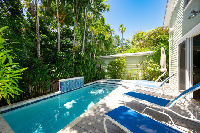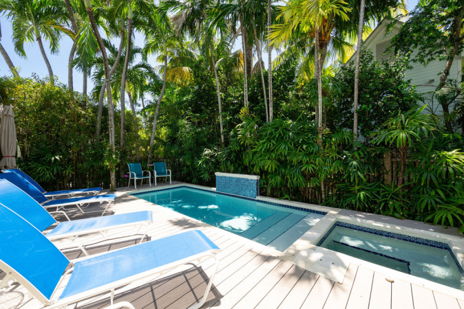 This Key West getaway’s open format, soaring vaulted ceilings, and spacious common area are ideal for celebrations, birthdays, and spending precious vacation time together. It has a massive table for 8, ample fridge and freezer space for all your snacks and refreshments, and plenty of couch seating for everyone to gather. The party continues as you step right outside into your own private backyard paradise surrounded by fluffy tropical plants, blooming orchids, and darting lizards. The sparkling swimming pool, hottub, and spacious deck are perfect for sunbathing, grilling, and unwinding.
