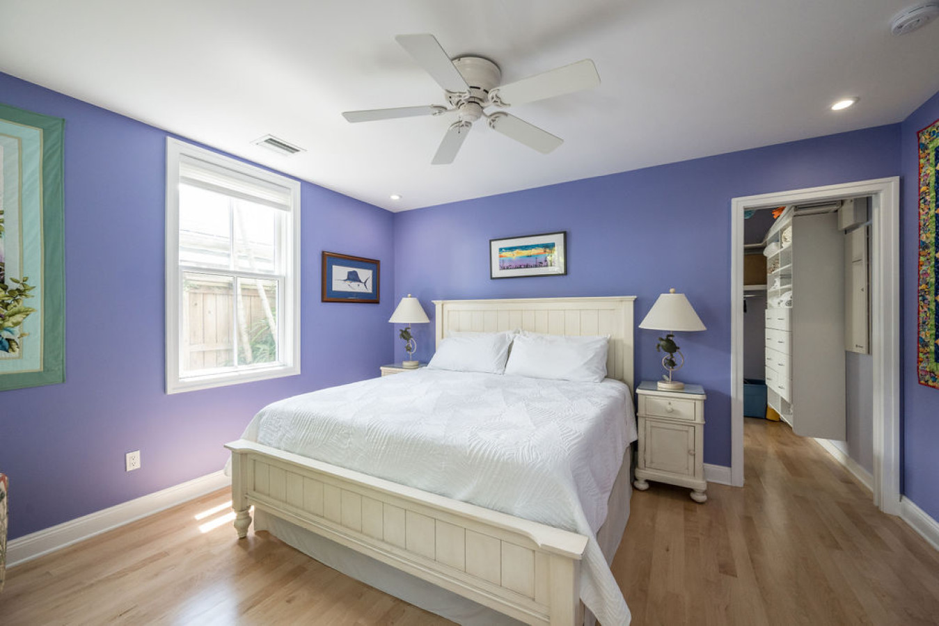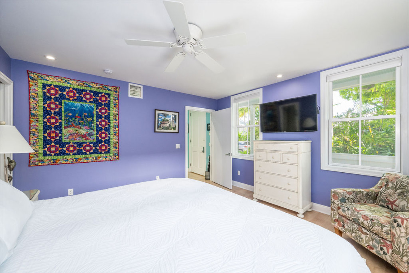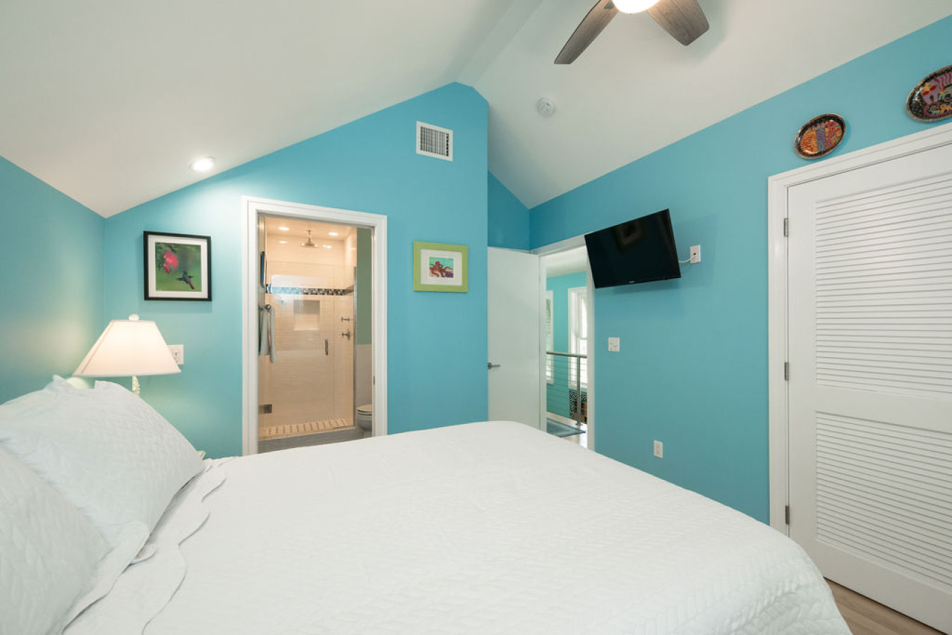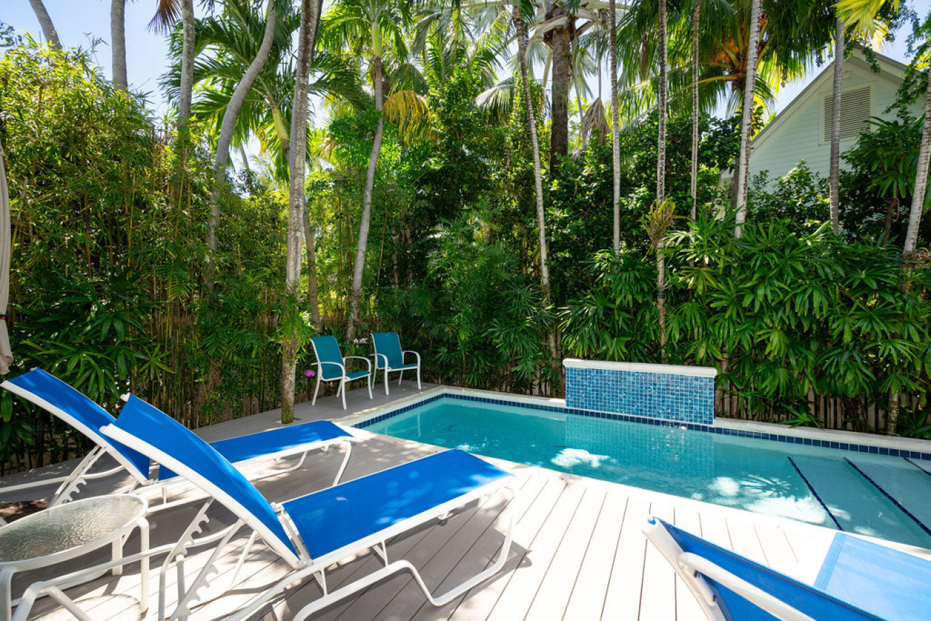 This Key West getaway’s open format, soaring vaulted ceilings, and spacious common area are ideal for celebrations, birthdays, and spending precious vacation time together. It has a massive table for 8, ample fridge and freezer space for all your snacks and refreshments, and plenty of couch seating for everyone to gather. The party continues as you step right outside into your own private backyard paradise surrounded by fluffy tropical plants, blooming orchids, and darting lizards. The sparkling swimming pool, hottub, and spacious deck are perfect for sunbathing, grilling, and unwinding.