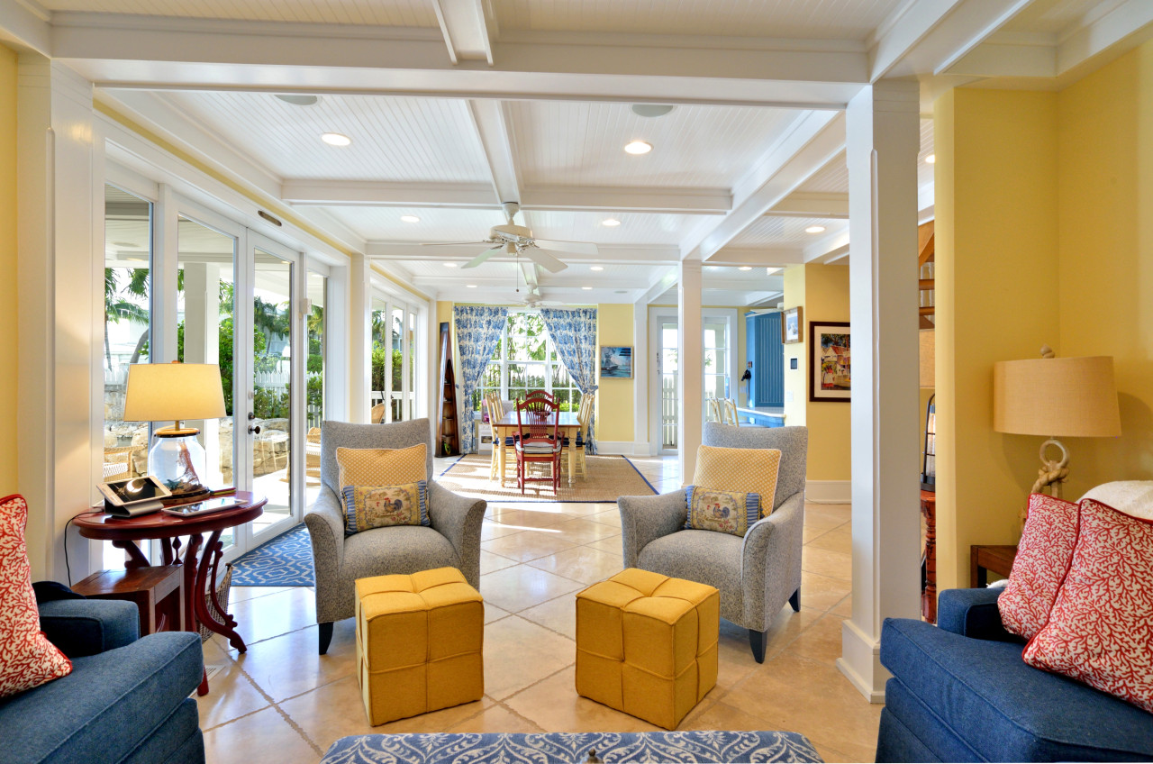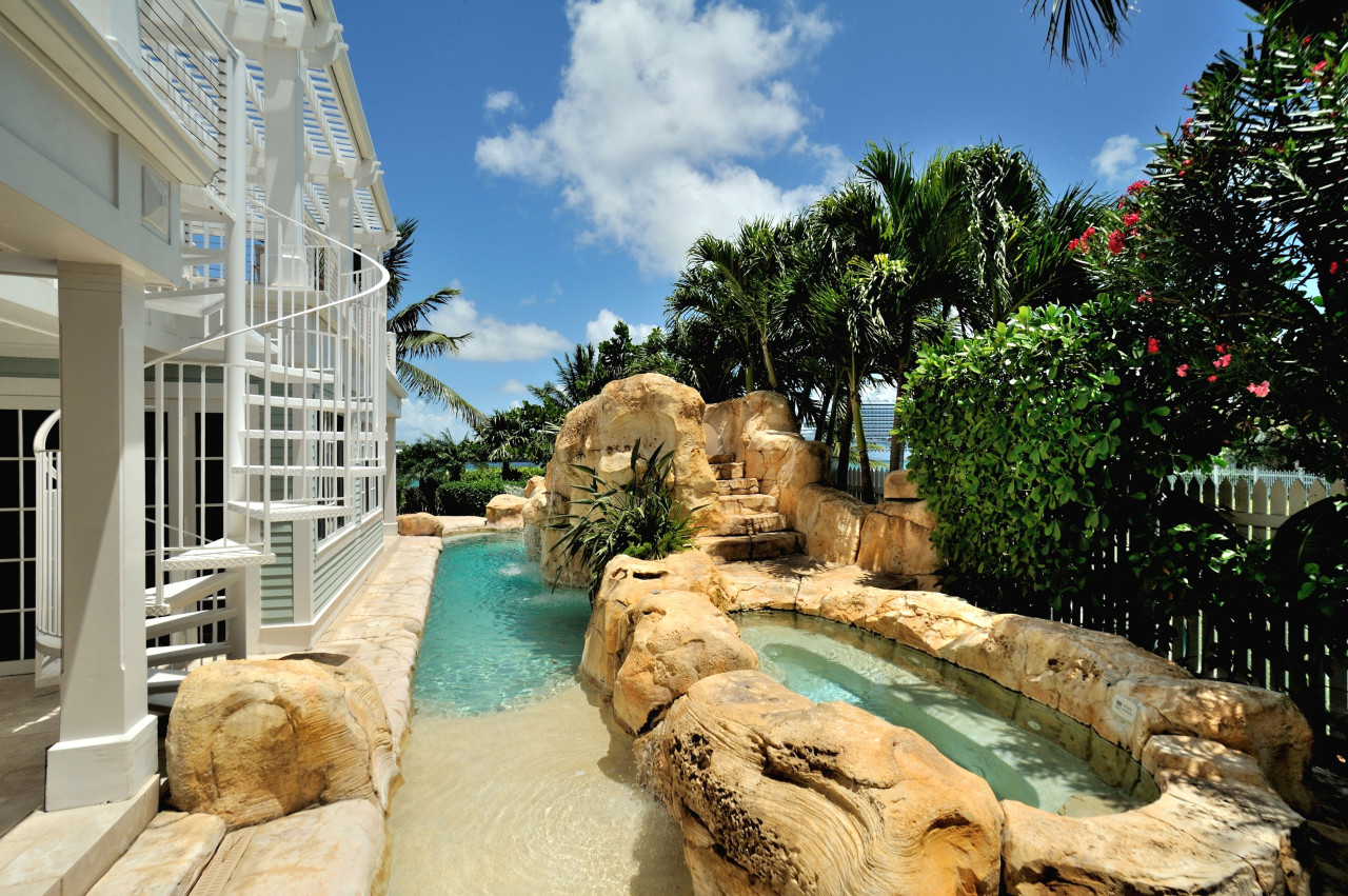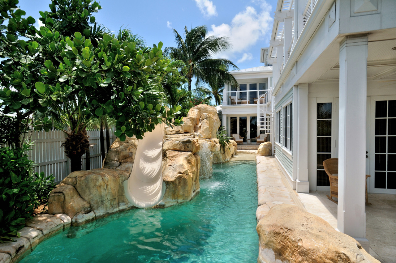 Approaching the beach house, you’re greeted by classic Key West charm with its white picket fence, expansive front porches on both levels, and a ‘widow’s walk’ observation tower. At the rear, a custom-designed swimming pool features rock waterfalls and double-level pools, complemented by an iron spiral staircase providing convenient access from the second floor. The flagstone patio garden, hammock, and pathway leading to the sandy beach enhance the tropical experience, seamlessly blending indoor and outdoor living spaces.