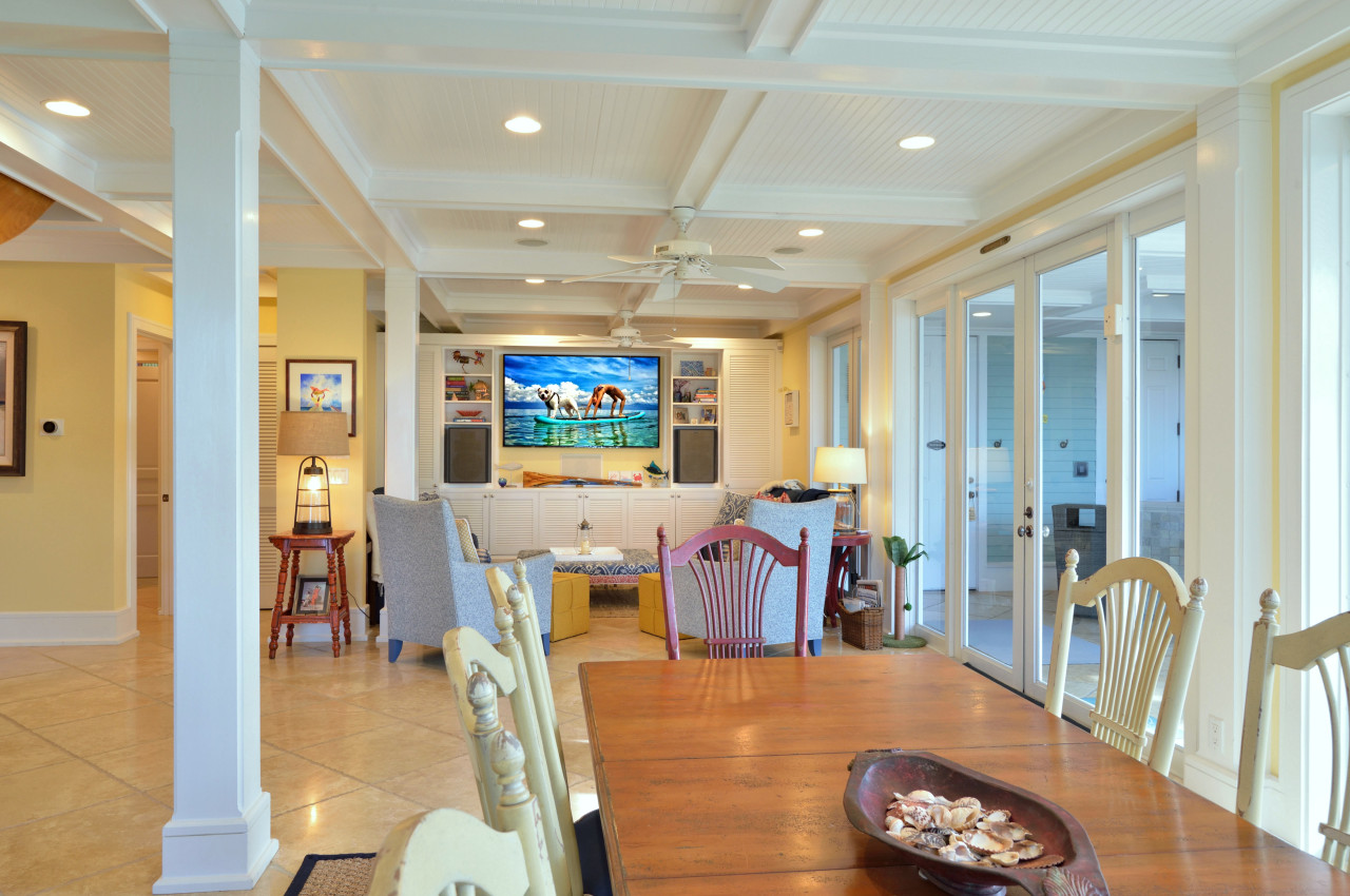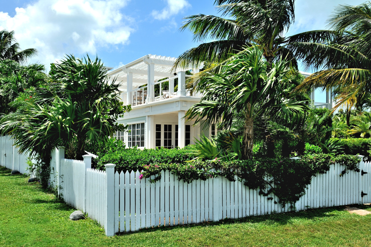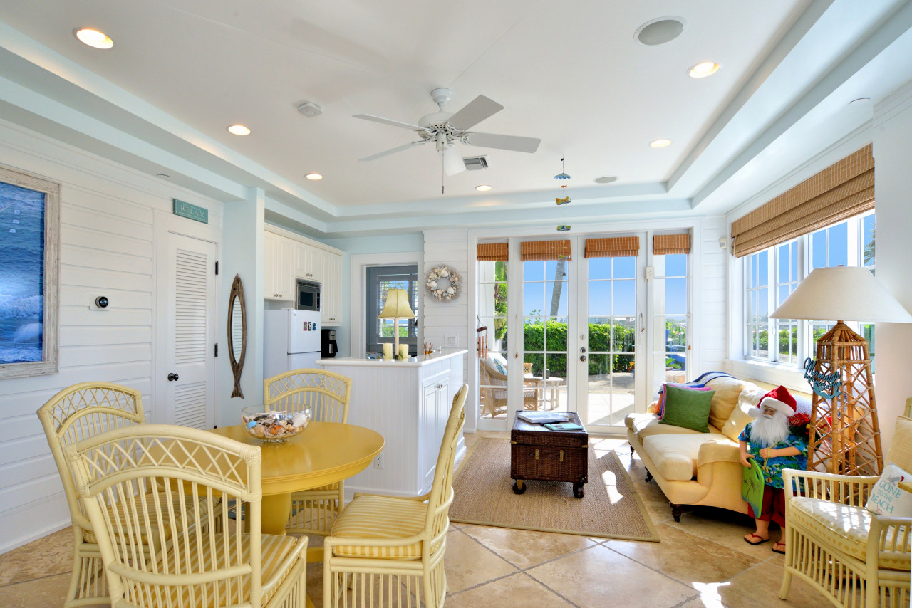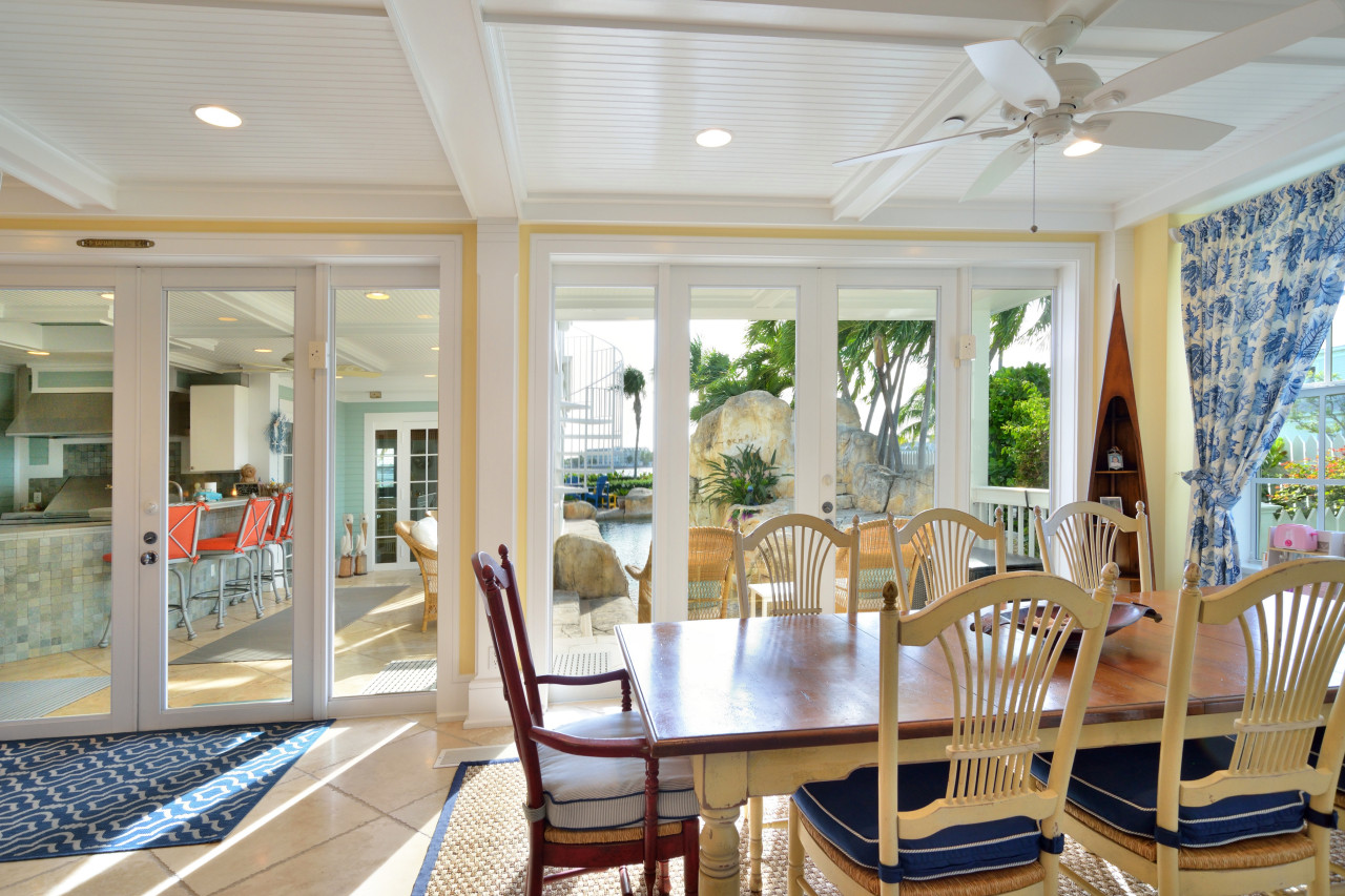 Approaching the beach house, you’re greeted by classic Key West charm with its white picket fence, expansive front porches on both levels, and a ‘widow’s walk’ observation tower. At the rear, a custom-designed swimming pool features rock waterfalls and double-level pools, complemented by an iron spiral staircase providing convenient access from the second floor. The flagstone patio garden, hammock, and pathway leading to the sandy beach enhance the tropical experience, seamlessly blending indoor and outdoor living spaces.
