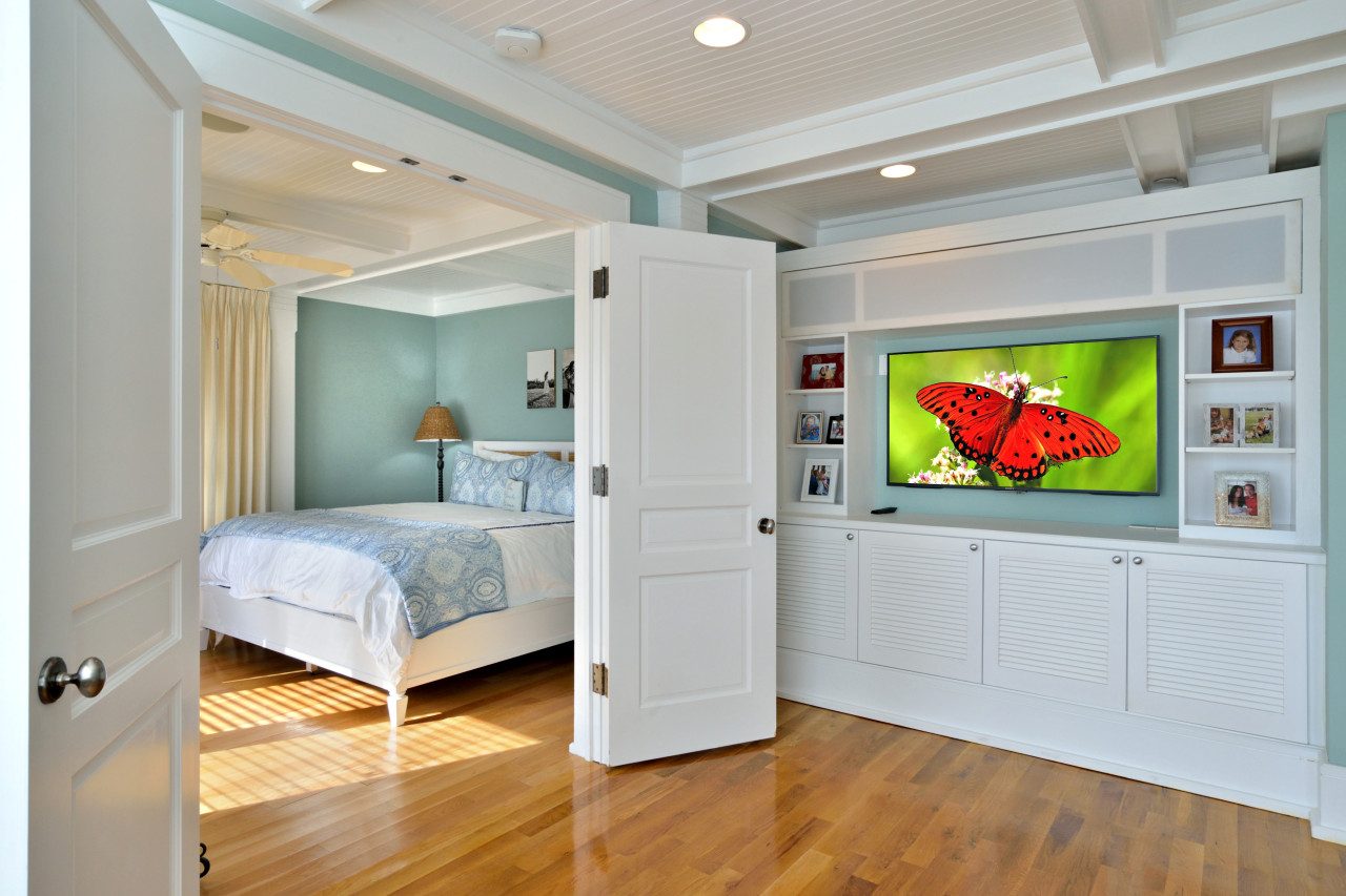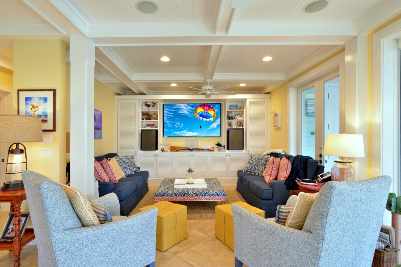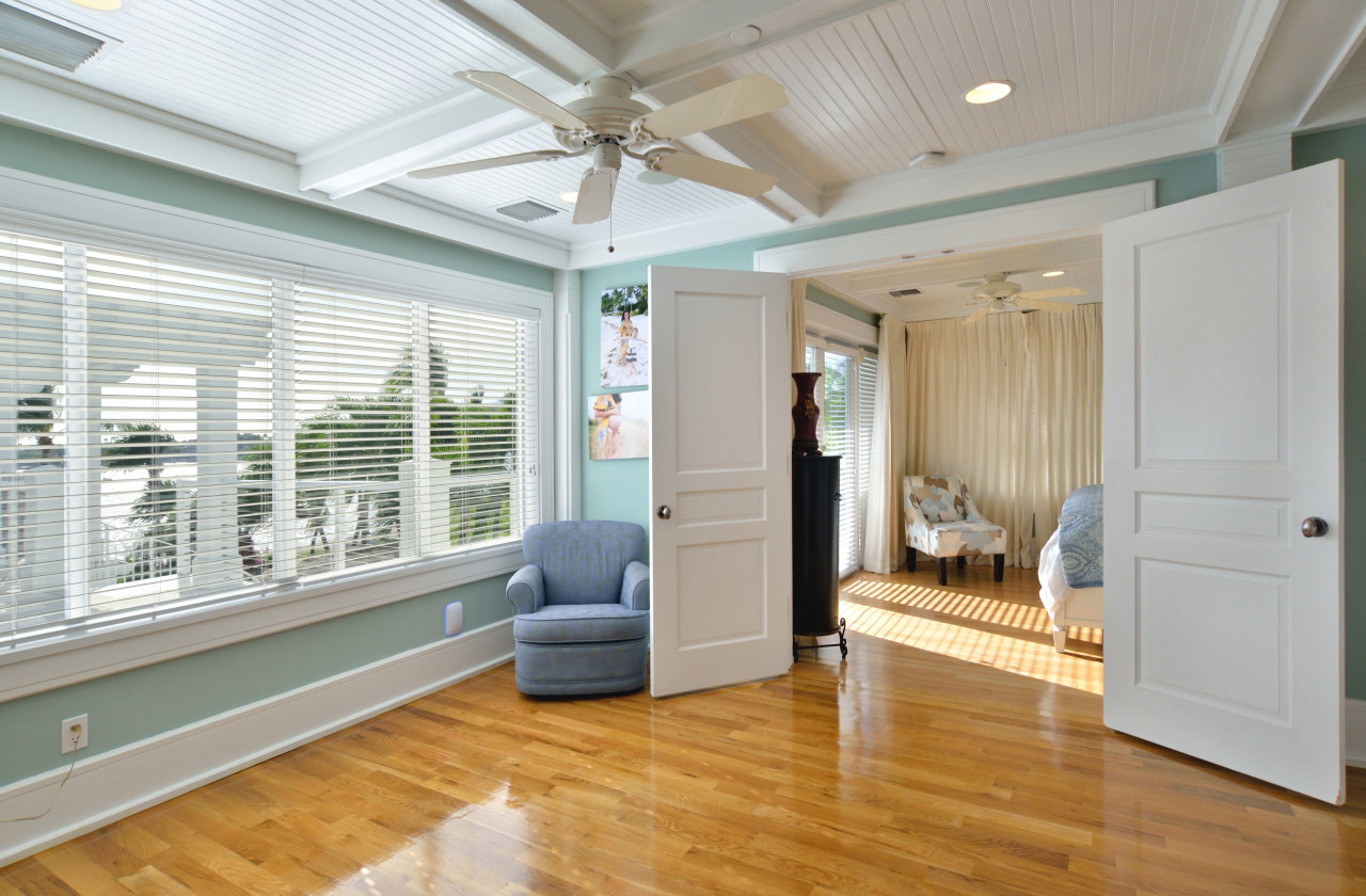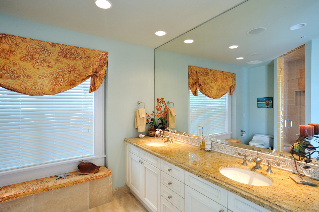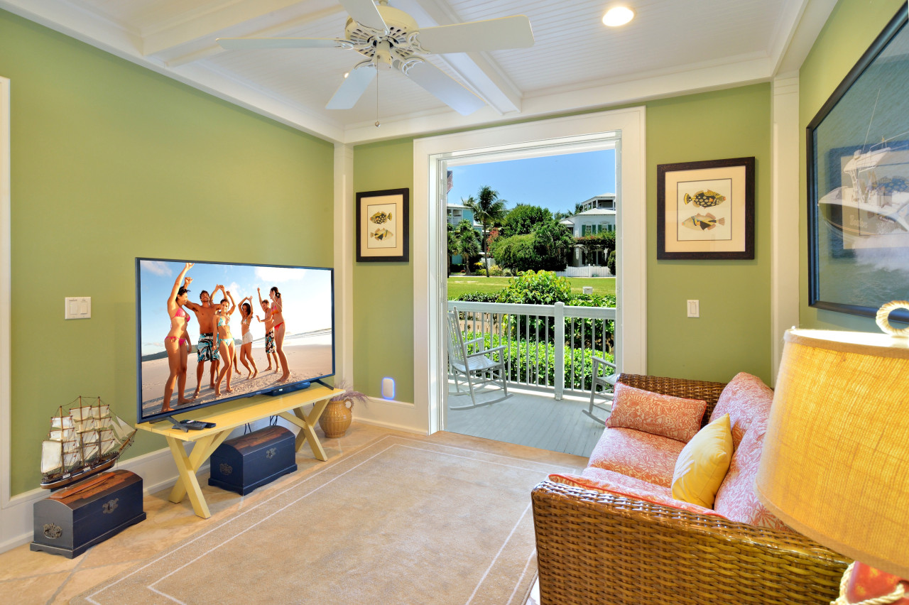 Master Suite: The rear master suite includes a private sitting/media room with a 40-inch flat-screen TV, a king-size hand-carved bed, and French doors leading to a second-floor porch. The spacious luxury bath features travertine marble, double sinks, a granite vanity, and a ‘secret door’ leading to a lattice-topped deck with ocean views.