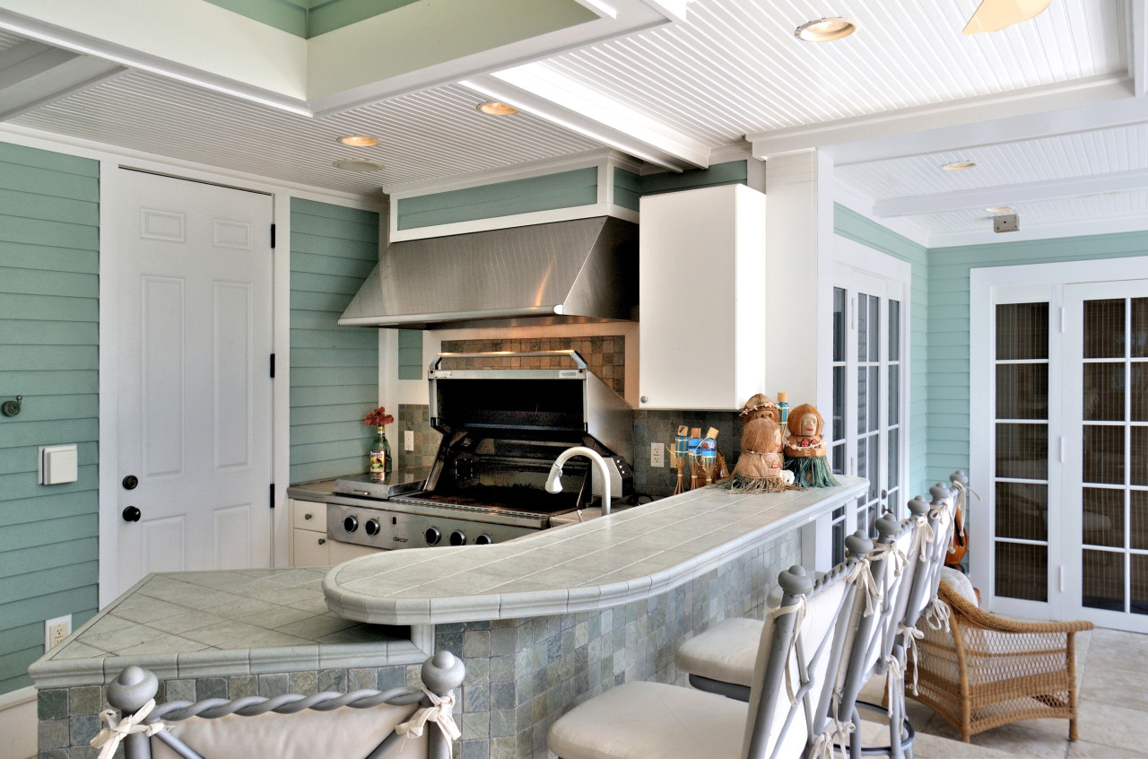 A versatile family room with a tropical vibe serves as a perfect space for outdoor living. The area includes a barbecue setup and a bar, ideal for hosting gatherings and enjoying the island lifestyle.