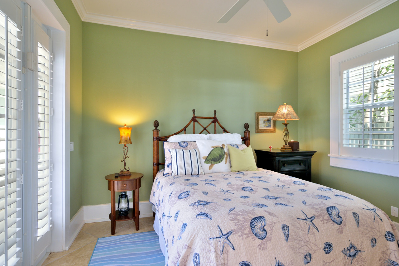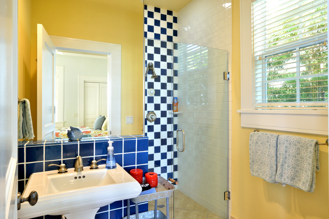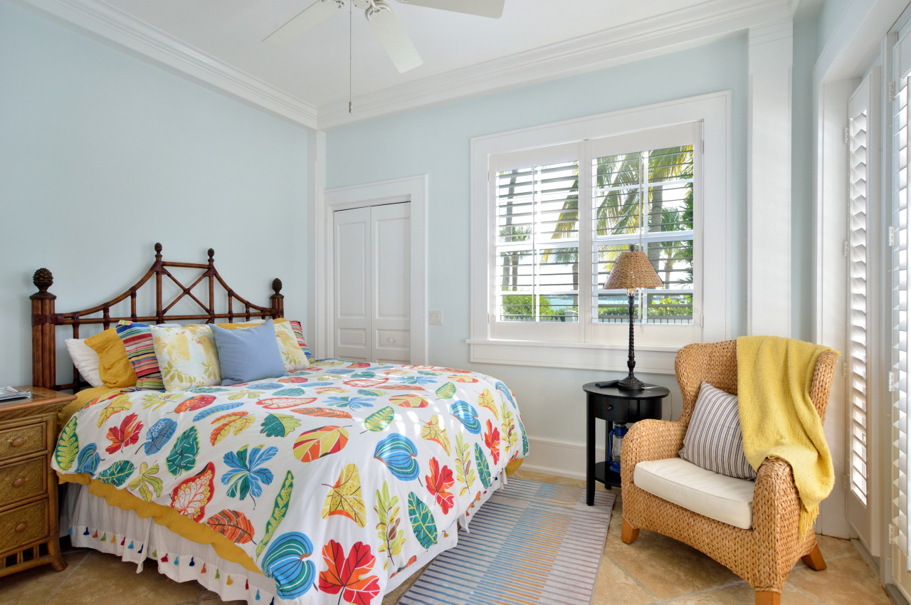Bedrooms 4 & 5: The guest cottage is connected to the main house by the breezeway. Bedroom 4 features sky-blue walls and honey-colored wicker furnishings, with an en-suite bathroom in vibrant yellow. Bedroom 5, painted sea-grass green, includes a queen-sized bed and an en-suite bathroom with a checkerboard-tiled shower.