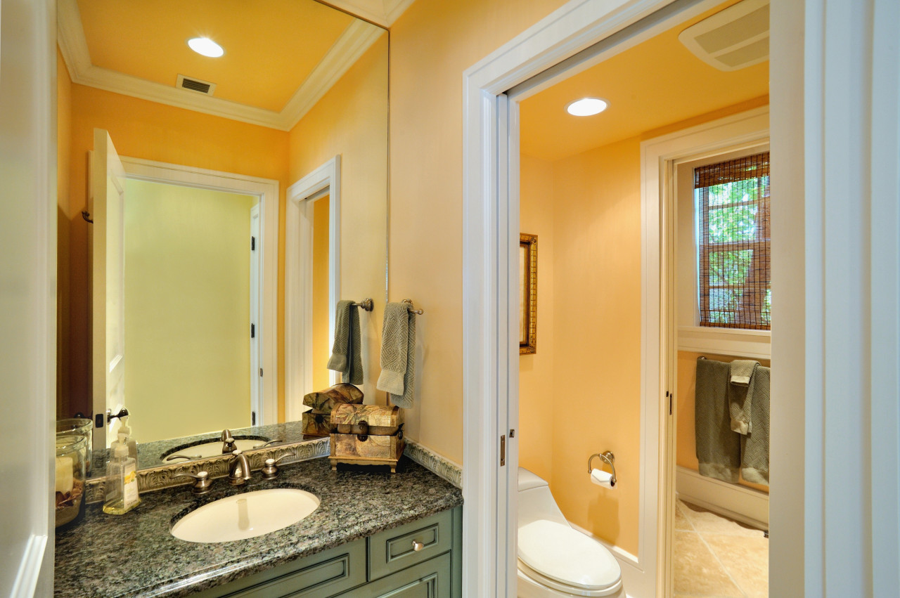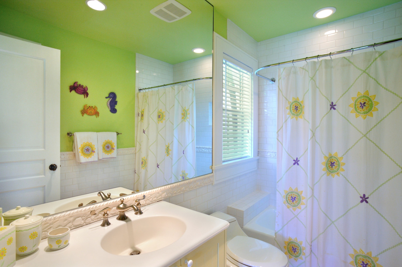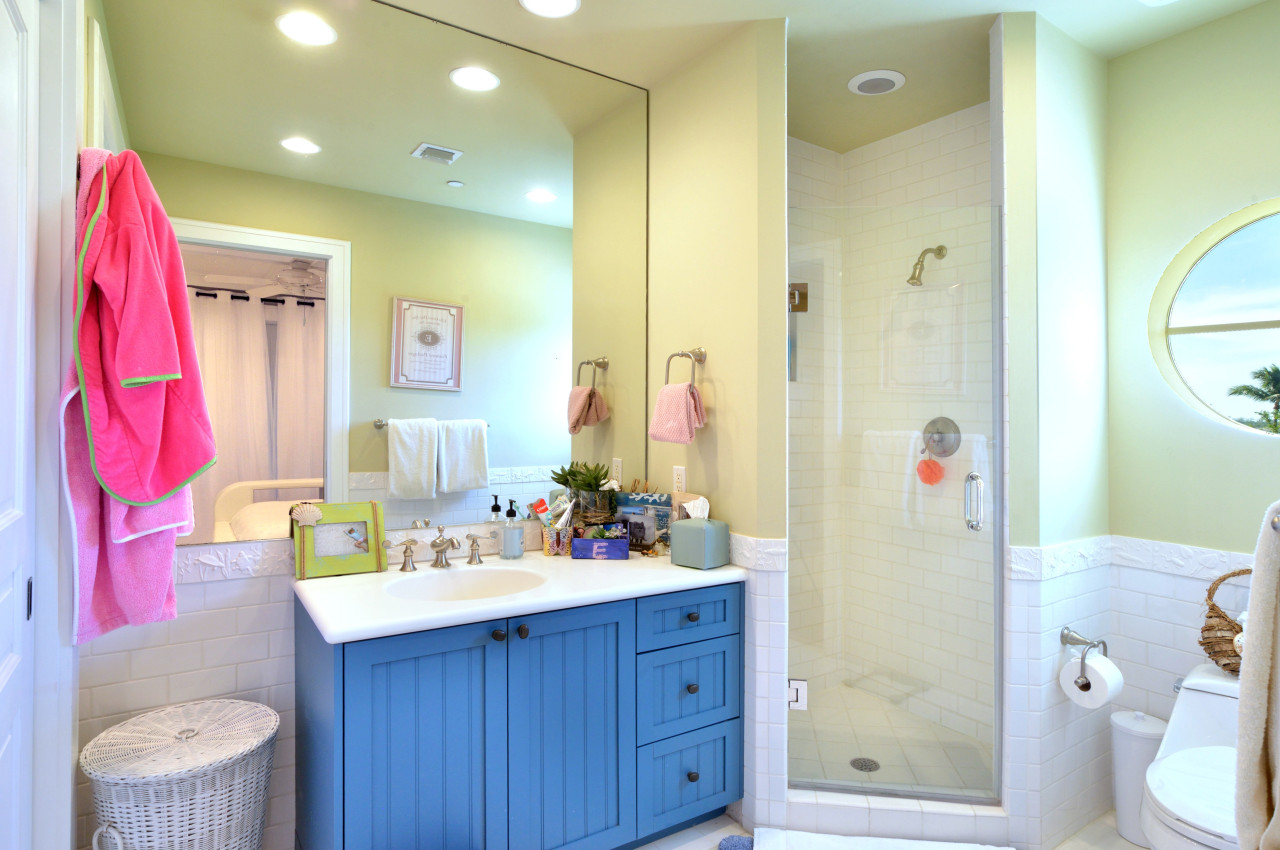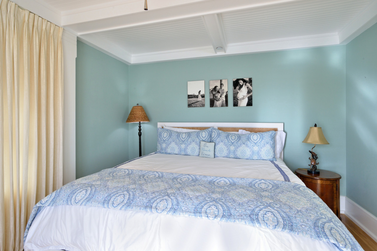 Bedrooms 4 & 5: The guest cottage is connected to the main house by the breezeway. Bedroom 4 features sky-blue walls and honey-colored wicker furnishings, with an en-suite bathroom in vibrant yellow. Bedroom 5, painted sea-grass green, includes a queen-sized bed and an en-suite bathroom with a checkerboard-tiled shower.