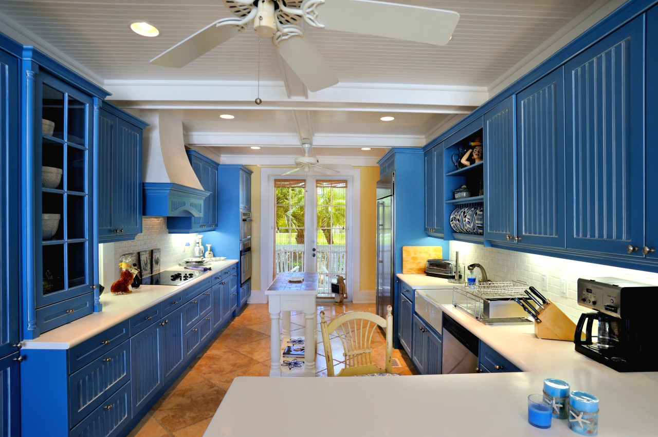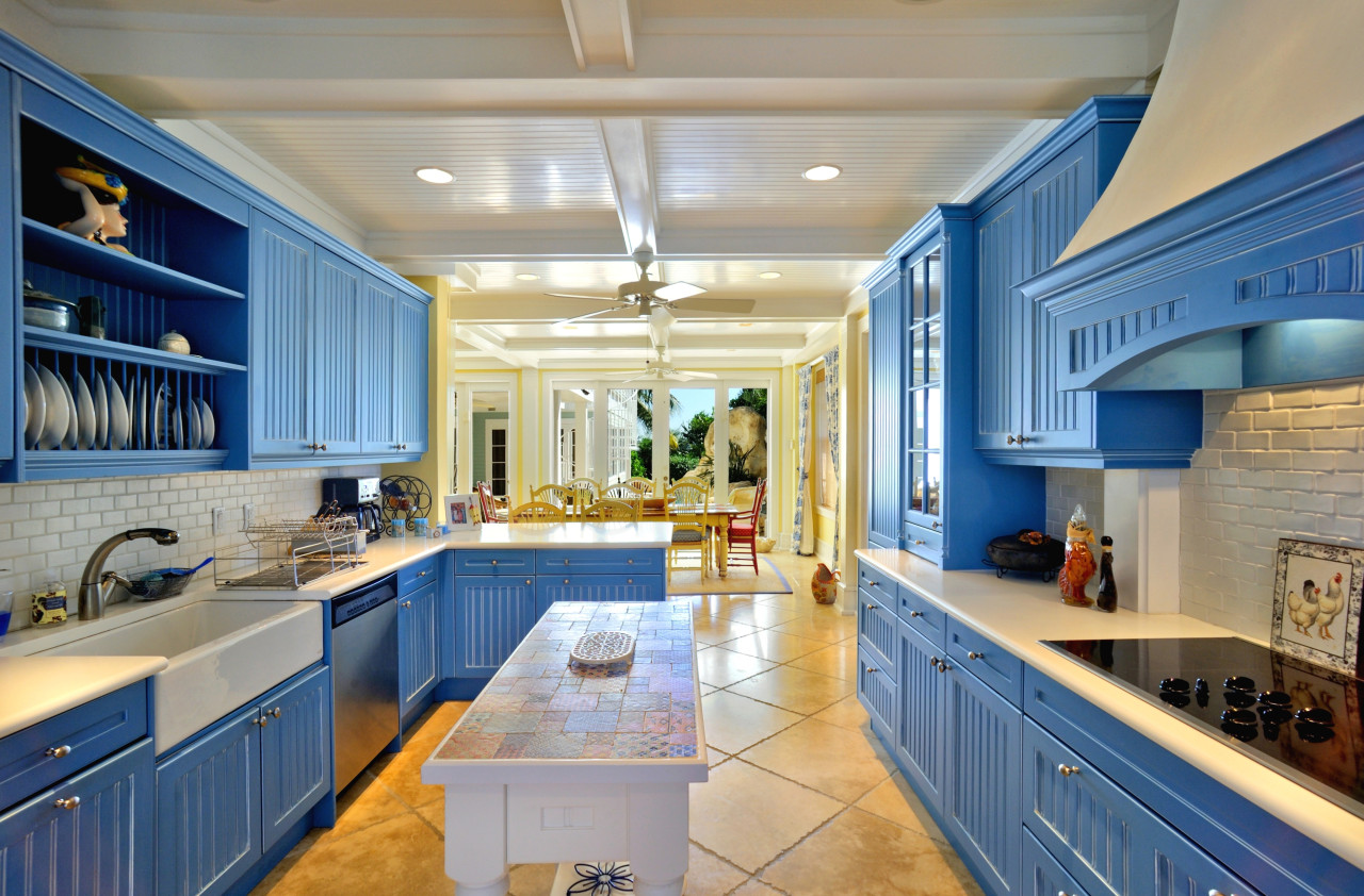 Entrance and Great Room: Enter through an impressive custom wooden staircase and discover an open floor plan featuring travertine marble floors and coastal furnishings. The great room extends across the entire length of the house, incorporating a blue and white coastal kitchen with bead-board cabinets and white Corian countertops. The kitchen includes double ovens and a breakfast bar, leading into a sunlit dining area with French doors opening to the garden.