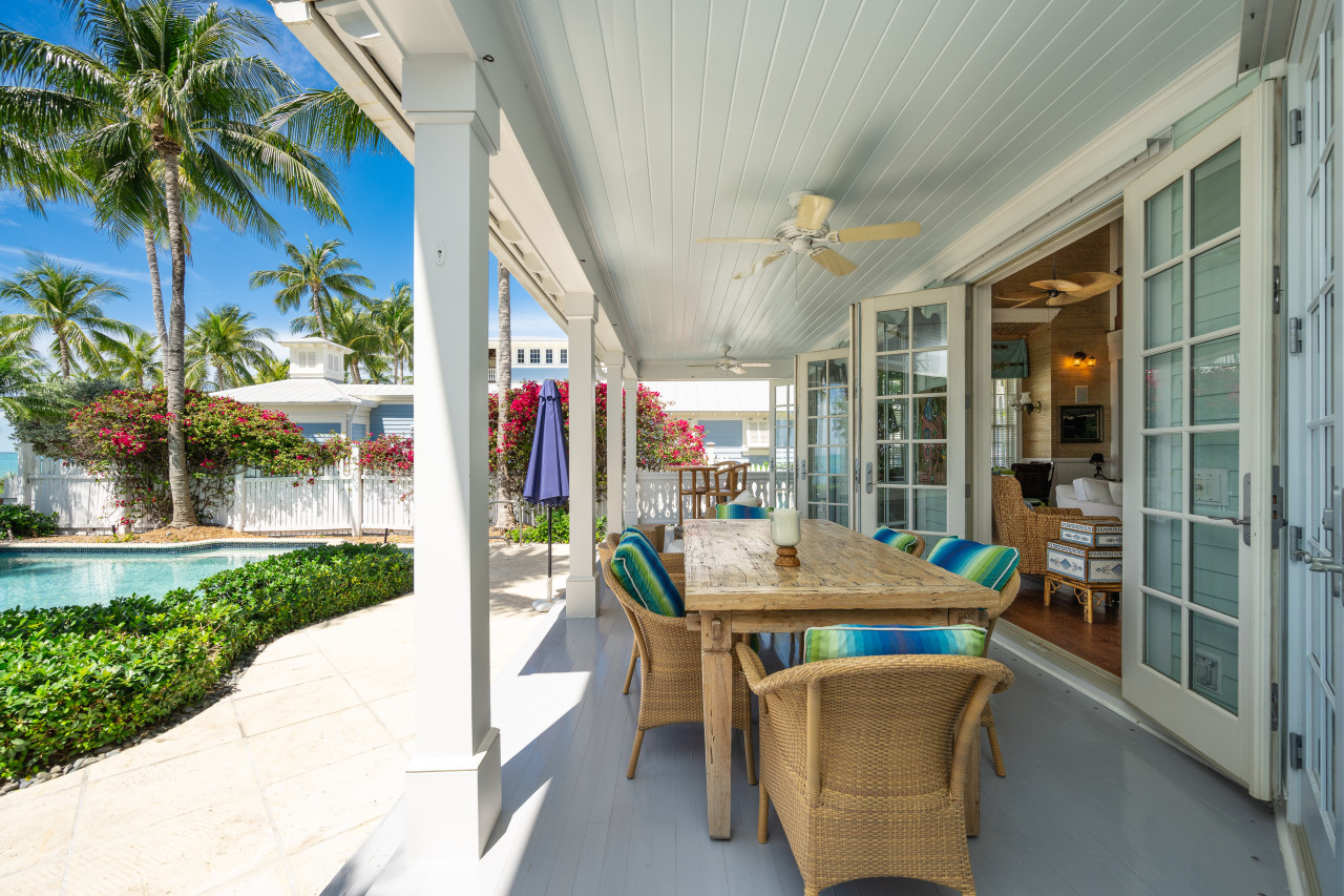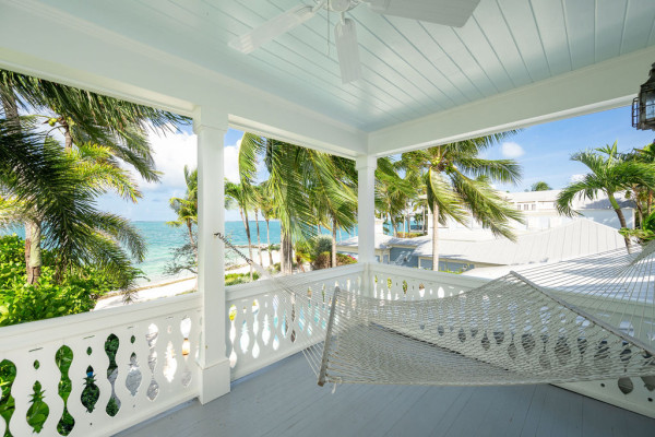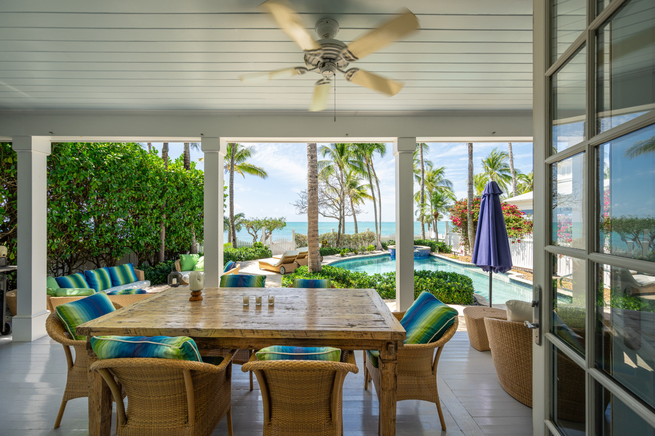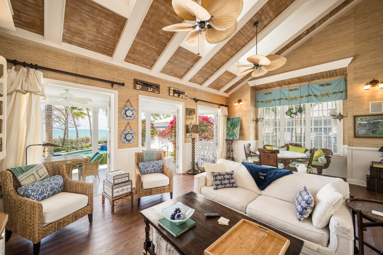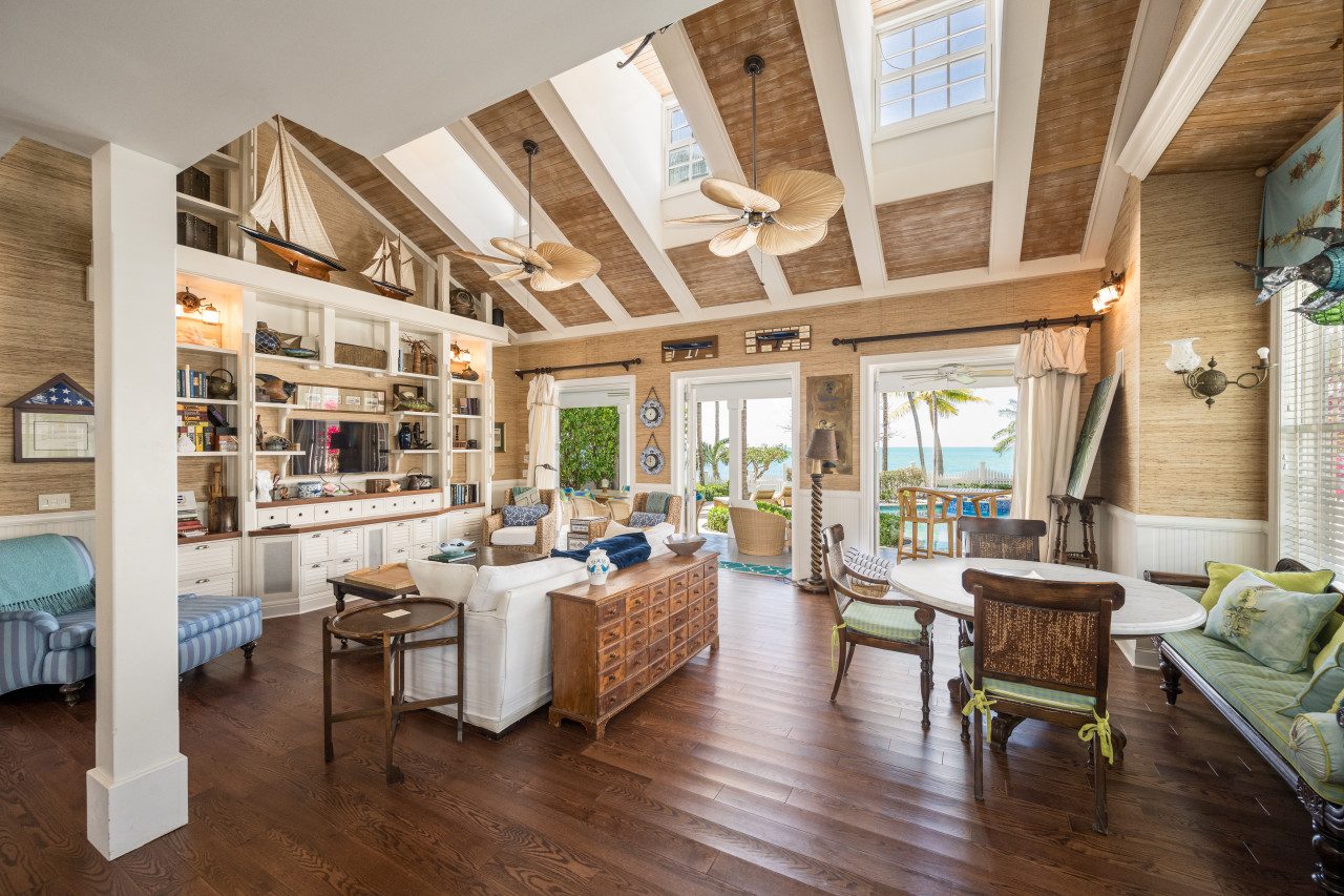 This standout property at 10 Sunset Key is the beloved island home of a world champion sailor, whose maximal nautical style immerses you in ocean life without ever leaving land. Vaulted ceilings, model helms and monohulls, coiled ropes, and other seafaring details fill the living room, which sits just off a calming blue kitchen and overlooks the pool and ocean beyond. The main level also features a spacious king bedroom with a full bathroom and direct walkout to the covered porch.